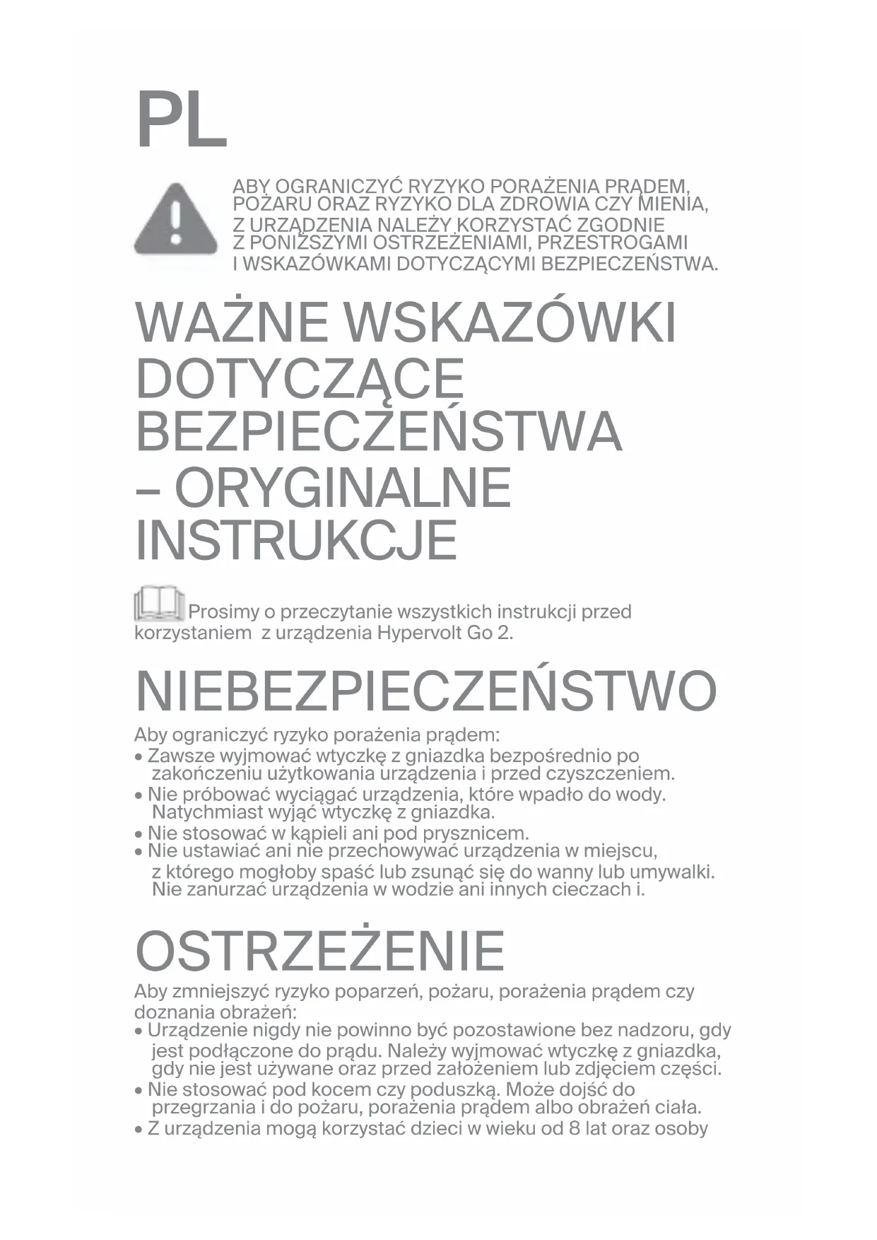 DOTYCZĄCE BEZPIECZEŃSTWA – ORYGINALNE INSTRUKCJE Prosimy o przeczytanie wszystkich instrukcji przed korzystaniem z urządzenia Hypervolt Go 2. NIEBEZPIECZEŃSTWO Aby ograniczyć ryzyko porażenia prądem: