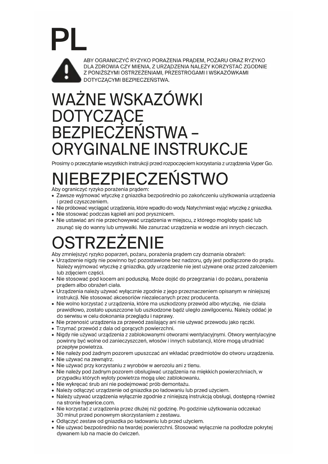 DOTYCZĄCE BEZPIECZEŃSTWA – ORYGINALNE INSTRUKCJE Prosimy o przeczytanie wszystkich instrukcji przed rozpoczęciem korzystania z urządzenia Vyper Go. NIEBEZPIECZEŃSTWO Aby ograniczyć ryzyko porażenia prądem: