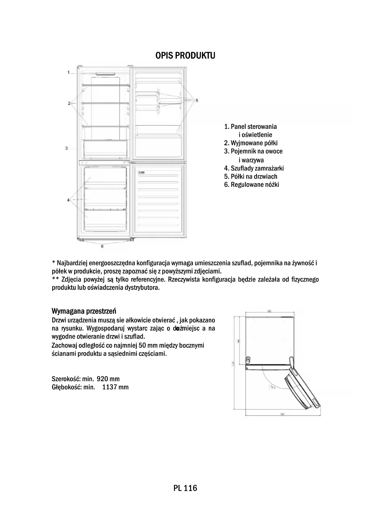 - Najbardziej energooszczędna konfiguracja wymaga umieszczenia szuflad, pojemnika na żywność i półek w produkcie, proszę zapoznać się z powyższymi zdjęciami. ** Zdjęcia powyżej są tylko referencyjne. Rzeczywista konfiguracja będzie zależała od fizycznego produktu lub oświadczenia dystrybutora. Wymagana przestrzeń Drzwi urządzenia muszą sie ałkowicie otwierać , jak pokazano na rysunku. Wygospodaruj wystarc zając o dużo miejsc a na wygodne otwieranie drzwi i szuflad. Zachowaj odległość co najmniej 50 mm między bocznymi ścianami produktu a sąsiednimi częściami. Szerokość: min. 920 mm Głębokość: min. 1137 mmPL 117 UŻYTKOWANIE ➀ Przycisk WŁ./WYŁ. służy do włączania/wyłączania urządzenia. ➁ Przycisk SET służy do wyboru temperatury w lodówce lub funkcji specjalnych. ➂ Ikona Wi-Fi pokazuje, czy urządzenie jest połączone z aplikacją. ➃ Ikona Super Cool pokazuje, czy funkcja jest aktywna. ➄ Poziomy temperatury pokazują, która temperatura jest wybrana. Użytkowanie