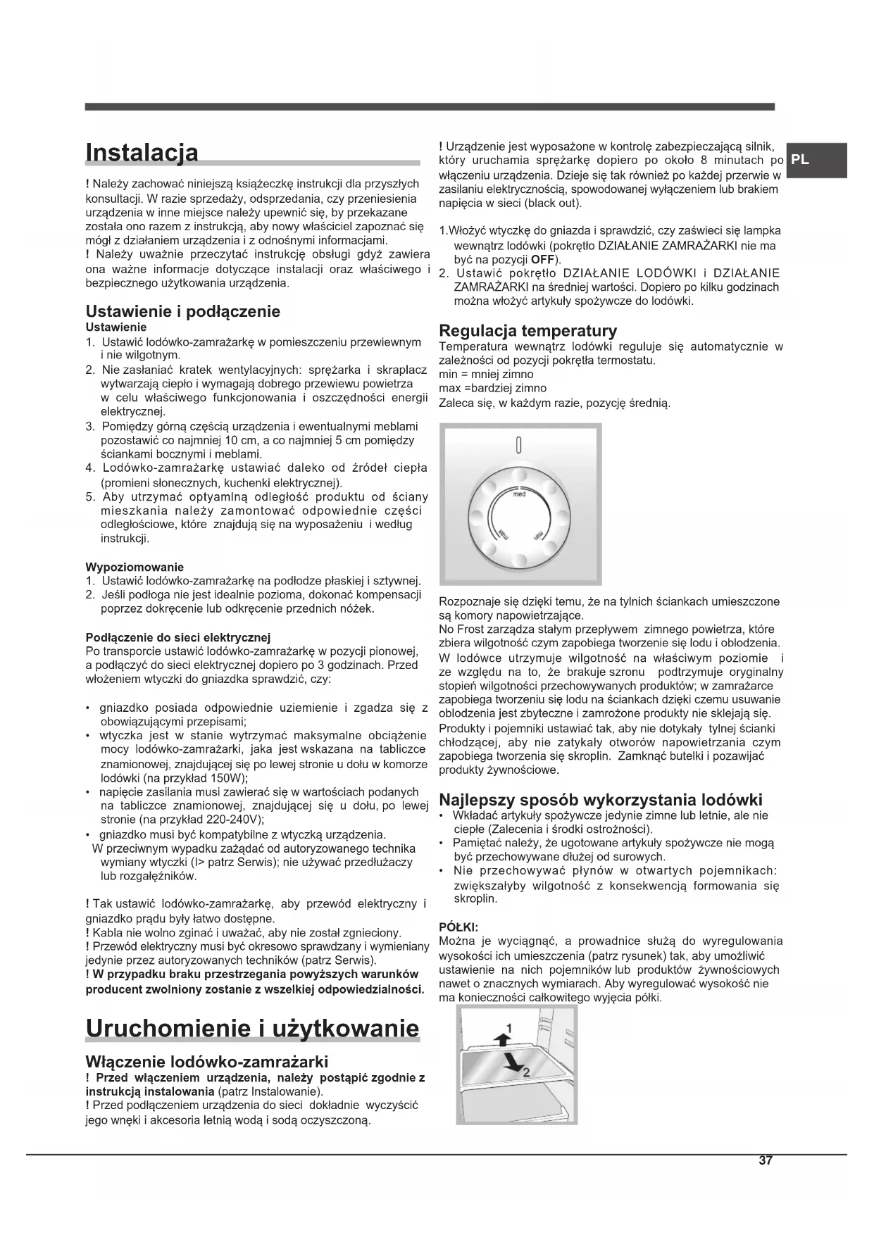 ZAMRAŻARKI na średniej wartości. Dopiero po kilku godzinach można włożyć artykuły spożywcze do lodówki. Regulacja temperatury Temperatura wewnątrz lodówki reguluje się automatycznie w zależności od pozycji pokrętła termostatu. min = mniej zimno max =bardziej zimno Zaleca się, w każdym razie, pozycję średnią. Rozpoznaje się dzięki temu, że na tylnich ściankach umieszczone są komory napowietrzające. No Frost zarządza stałym przepływem zimnego powietrza, które zbiera wilgotność czym zapobiega tworzenie się lodu i oblodzenia. W lodówce utrzymuje wilgotność na właściwym poziomie i ze względu na to, że brakuje szronu podtrzymuje oryginalny stopień wilgotności przechowywanych produktów; w zamrażarce zapobiega tworzeniu się lodu na ściankach dzięki czemu usuwanie oblodzenia jest zbyteczne i zamrożone produkty nie sklejają się. Produkty i pojemniki ustawiać tak, aby nie dotykały tylnej ścianki chłodzącej, aby nie zatykały otworów napowietrzania czym zapobiega tworzenia się skroplin. Zamknąć butelki i pozawijać produkty żywnościowe. Najlepszy sposób wykorzystania lodówki