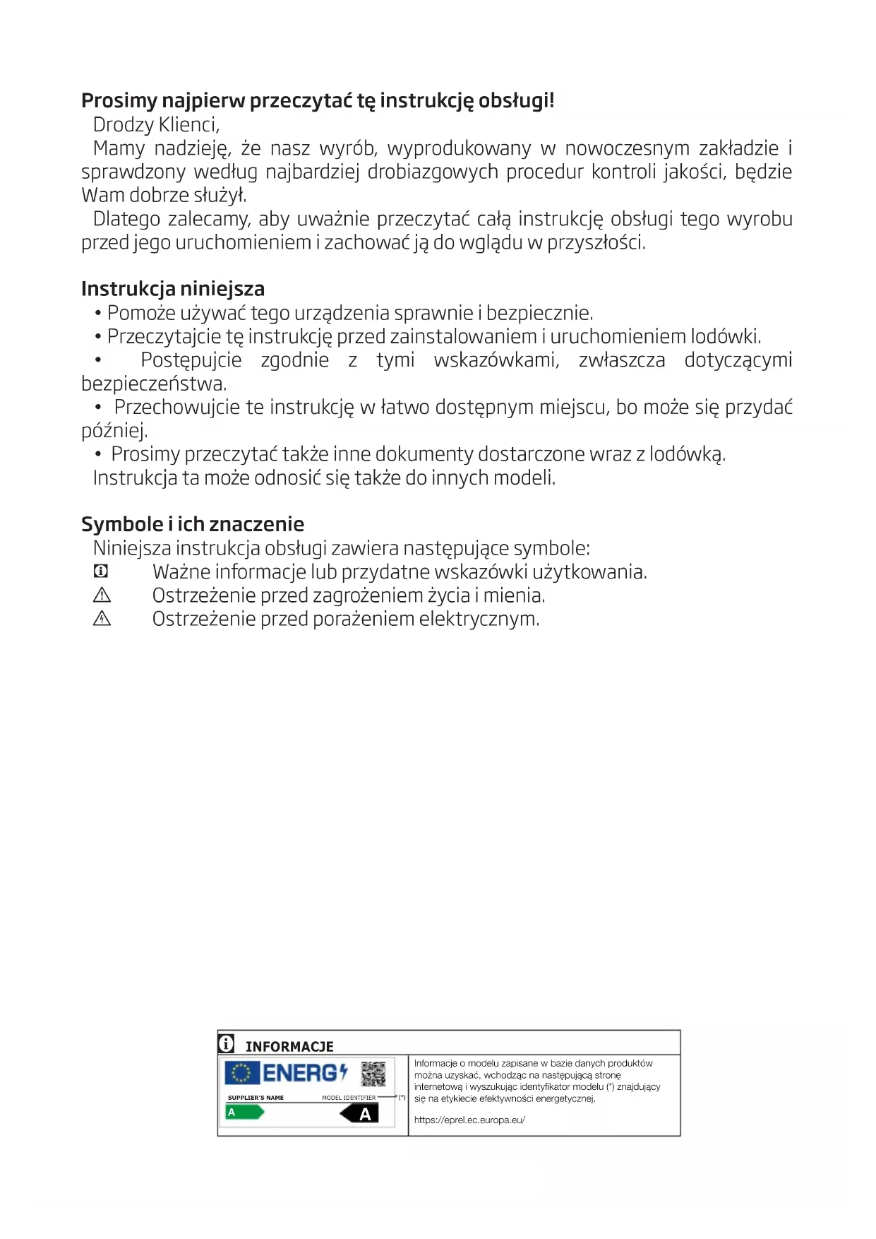 - Przeczytajcie tę instrukcję przed zainstalowaniem i uruchomieniem lodówki.
