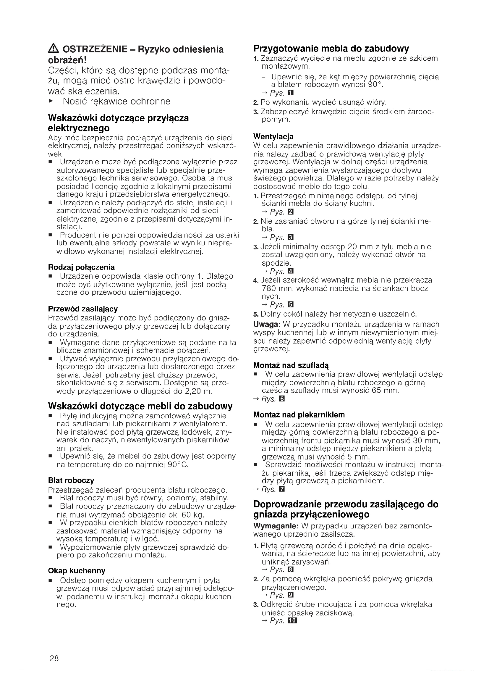 Wskazówki ogólne ¡ Należy dokładnie przeczytać niniejszą in- strukcję. ¡ Tylko certyfikowany fachowiec może pod- łączyć urządzenie. ¡ Nieprawidłowa instalacja, otwarcie urzą- dzenia, podłączenie lub montaż powodują unieważnienie gwarancji na produkt. ¡ Przed przystąpieniem do jakichkolwiek prac odłączyć zasilanie. ¡ Po ukończeniu instalacji należy upewnić się, że użytkownik nie ma dostępu do elektrycznych elementów. ¡ Nigdy nie używać tego urządzenia na ło- dziach lub pojazdach. Bezpieczny montaż Podczas montażu urządzenia należy prze- strzegać zasad bezpieczeństwa. Bezpieczeństwo podczas użytkowania za- pewnione jest tylko po prawidłowym zamon- towaniu zgodnie z instrukcją montażu. Mon- ter jest odpowiedzialny za prawidłowe dzia- łanie w miejscu instalacji urządzenia. OSTRZEŻENIE‒Niebezpieczeństwo: oddziaływanie magnetyczne! Urządzenie zawiera magnesy trwałe. Mogą one mieć wpływ na działanie implantów elektronicznych, np. rozruszników serca lub pomp insulinowych. ▶ Osoby posiadające implanty elektroniczne powinny zachowywać odstęp co najmniej 10cm od urządzenia.28 OSTRZEŻENIE‒Ryzyko odniesienia obrażeń! Części, które są dostępne podczas monta- żu, mogą mieć ostre krawędzie i powodo- wać skaleczenia. ▶ Nosić rękawice ochronne Wskazówki dotyczące przyłącza elektrycznego Aby móc bezpiecznie podłączyć urządzenie do sieci elektrycznej, należy przestrzegać poniższych wskazó- wek. ¡ Urządzenie może być podłączone wyłącznie przez autoryzowanego specjalistę lub specjalnie prze- szkolonego technika serwisowego. Osoba ta musi posiadać licencję zgodnie z lokalnymi przepisami danego kraju i przedsiębiorstwa energetycznego. ¡ Urządzenie należy podłączyć do stałej instalacji i zamontować odpowiednie rozłączniki od sieci elektrycznej zgodnie z przepisami dotyczącymi in- stalacji. ¡ Producent nie ponosi odpowiedzialności za usterki lub ewentualne szkody powstałe w wyniku niepra- widłowo wykonanej instalacji elektrycznej. Rodzaj połączenia ¡ Urządzenie odpowiada klasie ochrony 1. Dlatego może być użytkowane wyłącznie, jeśli jest podłą- czone do przewodu uziemiającego. Przewód zasilający Przewód zasilający może być podłączony do gniaz- da przyłączeniowego płyty grzewczej lub dołączony do urządzenia. ¡ Wymagane dane przyłączeniowe są podane na ta- bliczce znamionowej i schemacie połączeń. ¡ Używać wyłącznie przewodu przyłączeniowego do- łączonego do urządzenia lub dostarczonego przez serwis. Jeżeli potrzebny jest dłuższy przewód, skontaktować się z serwisem. Dostępne są prze- wody przyłączeniowe o długości do 2,20m. Wskazówki dotyczące mebli do zabudowy ¡ Płytę indukcyjną można zamontować wyłącznie nad szufladami lub piekarnikami z wentylatorem. Nie instalować pod płytą grzewczą lodówek, zmy- warek do naczyń, niewentylowanych piekarników ani pralek. ¡ Upewnić się, że mebel do zabudowy jest odporny na temperaturę do co najmniej 90°C. Blat roboczy Przestrzegać zaleceń producenta blatu roboczego. ¡ Blat roboczy musi być równy, poziomy, stabilny. ¡ Blat roboczy przeznaczony do zabudowy urządze- nia musi wytrzymać obciążenie ok. 60kg. ¡ W przypadku cienkich blatów roboczych należy zastosować materiał wzmacniający odporny na wysoką temperaturę i wilgoć. ¡ Wypoziomowanie płyty grzewczej sprawdzić do- piero po zakończeniu montażu. Okap kuchenny ¡ Odstęp pomiędzy okapem kuchennym i płytą grzewczą musi odpowiadać przynajmniej odstępo- wi podanemu w instrukcji montażu okapu kuchen- nego. Przygotowanie mebla do zabudowy