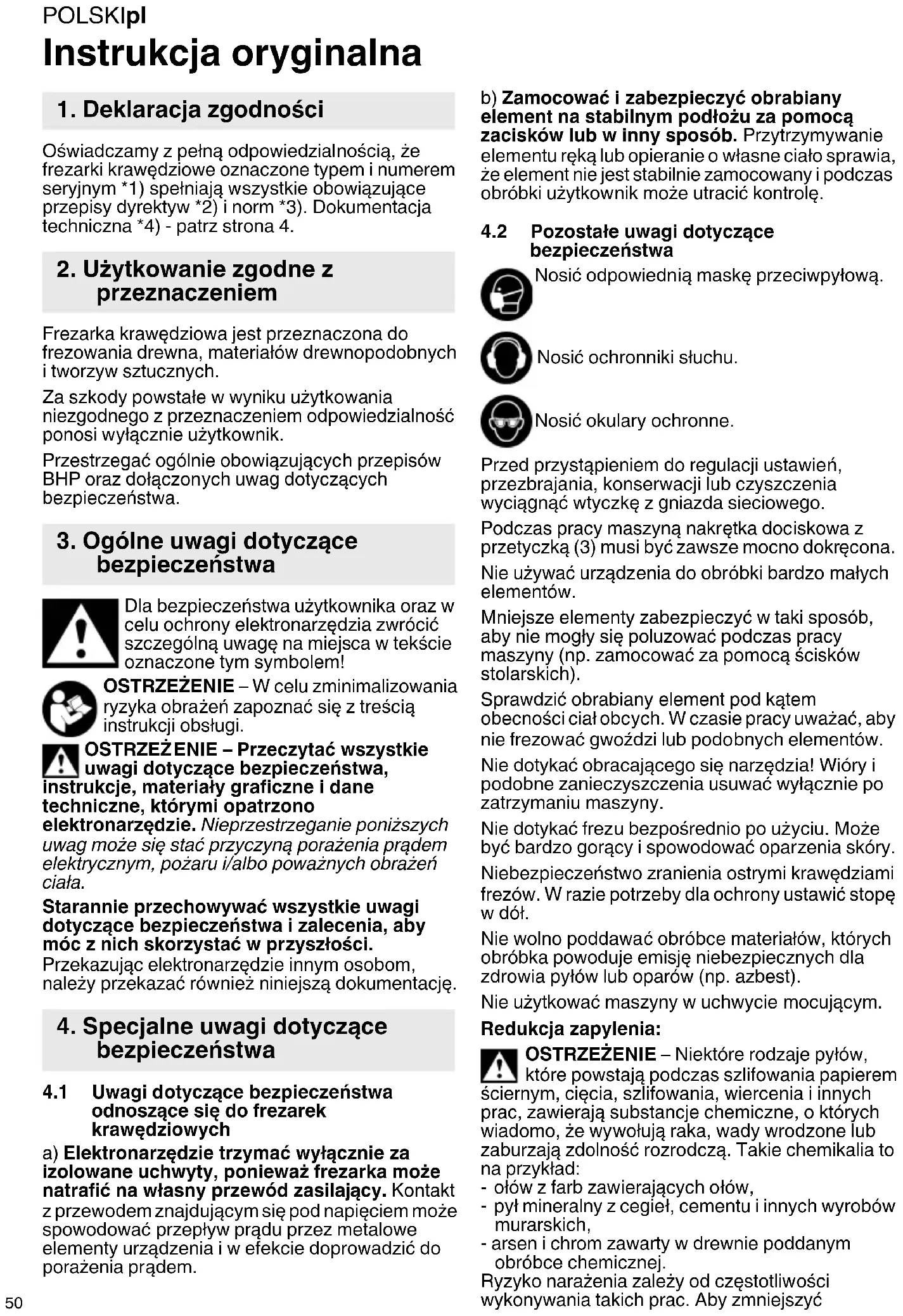 Instrukcja oryginalna Oświadczamy z pełną odpowiedzialnością, że frezarki krawędziowe oznaczone typem i numerem seryjnym *1) spełniają wszystkie obowiązujące przepisy dyrektyw *2) i norm *3). Dokumentacja techniczna *4) - patrz strona 4. Frezarka krawędziowa jest przeznaczona do frezowania drewna, materiałów drewnopodobnych i tworzyw sztucznych. Za szkody powstałe w wyniku użytkowania niezgodnego z przeznaczeniem odpowiedzialność ponosi wyłącznie użytkownik. Przestrzegać ogólnie obowiązujących przepisów BHP oraz dołączonych uwag dotyczących bezpieczeństwa. Dla bezpieczeństwa użytkownika oraz w celu ochrony elektronarzędzia zwrócić szczególną uwagę na miejsca w tekście oznaczone tym symbolem! OSTRZEŻENIE – W celu zminimalizowania ryzyka obrażeń zapoznać się z treścią instrukcji obsługi. OSTRZEŻ ENIE – Przeczytać wszystkie uwagi dotyczące bezpieczeństwa, instrukcje, materiały graficzne i dane techniczne, którymi opatrzono elektronarzędzie. Nieprzestrzeganie poniższych uwag może się stać przyczyną porażenia prądem elektrycznym, pożaru i/albo poważnych obrażeń ciała. Starannie przechowywać wszystkie uwagi dotyczące bezpieczeństwa i zalecenia, aby móc z nich skorzystać w przyszłości. Przekazując elektronarzędzie innym osobom, należy przekazać również niniejszą dokumentację.