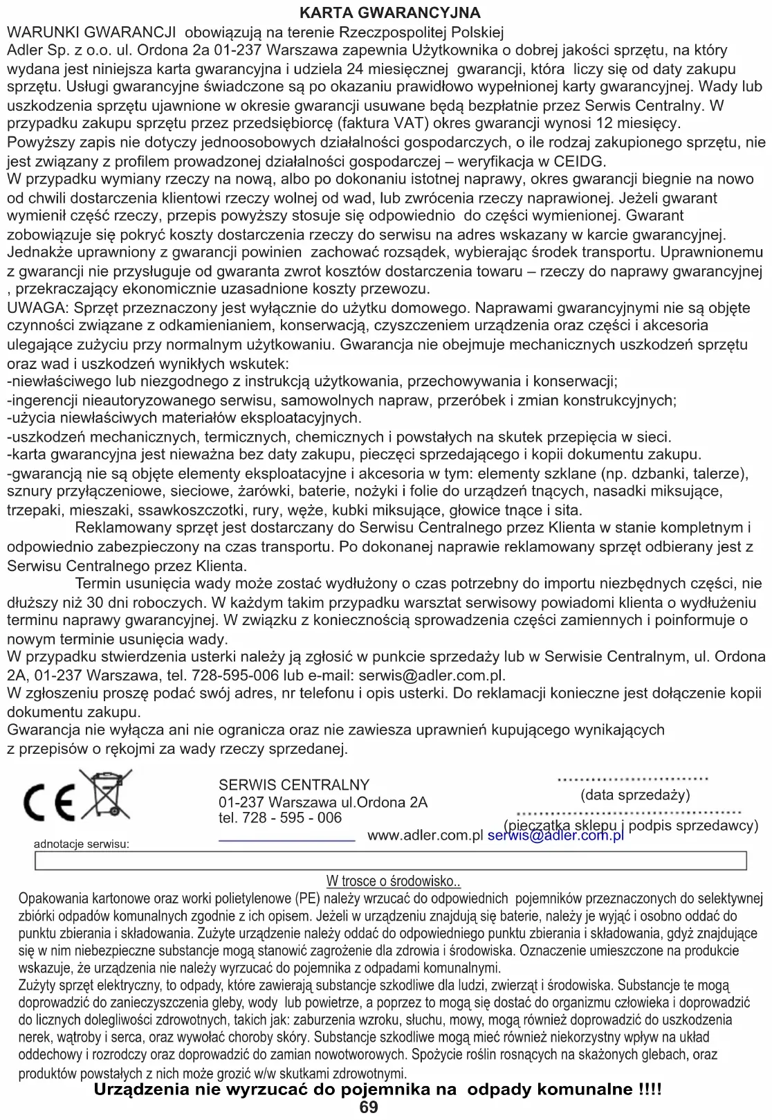 KARTA GWARANCYJNA W przypadku wymiany rzeczy na nową, albo po dokonaniu istotnej naprawy, okres gwarancji biegnie na nowo od chwili dostarczenia klientowi rzeczy wolnej od wad, lub zwrócenia rzeczy naprawionej. Jeżeli gwarant wymienił część rzeczy, przepis powyższy stosuje się odpowiednio do części wymienionej. Gwarant zobowiązuje się pokryć koszty dostarczenia rzeczy do serwisu na adres wskazany w karcie gwarancyjnej. Jednakże uprawniony z gwarancji powinien zachować rozsądek, wybierając środek transportu. Uprawnionemu z gwarancji nie przysługuje od gwaranta zwrot kosztów dostarczenia towaru – rzeczy do naprawy gwarancyjnej , przekraczający ekonomicznie uzasadnione koszty przewozu. -niewłaściwego lub niezgodnego z instrukcją użytkowania, przechowywania i konserwacji; -ingerencji nieautoryzowanego serwisu, samowolnych napraw, przeróbek i zmian konstrukcyjnych; Powyższy zapis nie dotyczy jednoosobowych działalności gospodarczych, o ile rodzaj zakupionego sprzętu, nie jest związany z profilem prowadzonej działalności gospodarczej – weryfikacja w CEIDG. -uszkodzeń mechanicznych, termicznych, chemicznych i powstałych na skutek przepięcia w sieci. -karta gwarancyjna jest nieważna bez daty zakupu, pieczęci sprzedającego i kopii dokumentu zakupu. -gwarancją nie są objęte elementy eksploatacyjne i akcesoria w tym: elementy szklane (np. dzbanki, talerze), sznury przyłączeniowe, sieciowe, żarówki, baterie, nożyki i folie do urządzeń tnących, nasadki miksujące, trzepaki, mieszaki, ssawkoszczotki, rury, węże, kubki miksujące, głowice tnące i sita. W przypadku stwierdzenia usterki należy ją zgłosić w punkcie sprzedaży lub w Serwisie Centralnym, ul. Ordona 2A, 01-237 Warszawa, tel. 728-595-006 lub e-mail: serwis@adler.com.pl. W zgłoszeniu proszę podać swój adres, nr telefonu i opis usterki. Do reklamacji konieczne jest dołączenie kopii dokumentu zakupu. UWAGA: Sprzęt przeznaczony jest wyłącznie do użytku domowego. Naprawami gwarancyjnymi nie są objęte czynności związane z odkamienianiem, konserwacją, czyszczeniem urządzenia oraz części i akcesoria ulegające zużyciu przy normalnym użytkowaniu. Gwarancja nie obejmuje mechanicznych uszkodzeń sprzętu oraz wad i uszkodzeń wynikłych wskutek: WARUNKI GWARANCJI obowiązują na terenie Rzeczpospolitej Polskiej Adler Sp. z o.o. ul. Ordona 2a 01-237 Warszawa zapewnia Użytkownika o dobrej jakości sprzętu, na który wydana jest niniejsza karta gwarancyjna i udziela 24 miesięcznej gwarancji, która liczy się od daty zakupu sprzętu. Usługi gwarancyjne świadczone są po okazaniu prawidłowo wypełnionej karty gwarancyjnej. Wady lub uszkodzenia sprzętu ujawnione w okresie gwarancji usuwane będą bezpłatnie przez Serwis Centralny. W przypadku zakupu sprzętu przez przedsiębiorcę (faktura VAT) okres gwarancji wynosi 12 miesięcy. Reklamowany sprzęt jest dostarczany do Serwisu Centralnego przez Klienta w stanie kompletnym i odpowiednio zabezpieczony na czas transportu. Po dokonanej naprawie reklamowany sprzęt odbierany jest z Serwisu Centralnego przez Klienta. Termin usunięcia wady może zostać wydłużony o czas potrzebny do importu niezbędnych części, nie dłuższy niż 30 dni roboczych. W każdym takim przypadku warsztat serwisowy powiadomi klienta o wydłużeniu terminu naprawy gwarancyjnej. W związku z koniecznością sprowadzenia części zamiennych i poinformuje o nowym terminie usunięcia wady. -użycia niewłaściwych materiałów eksploatacyjnych. z przepisów o rękojmi za wady rzeczy sprzedanej. Gwarancja nie wyłącza ani nie ogranicza oraz nie zawiesza uprawnień kupującego wynikających SERWIS CENTRALNY01-237 Warszawa ul.Ordona 2Atel. 728 - 595 - 006 www.adler.com.pl serwis@adler.com.pl(data sprzedaży)(pieczątka sklepu i podpis sprzedawcy)adnotacje serwisu: Urządzenia nie wyrzucać do pojemnika na odpady komunalne !!!! W trosce o środowisko.. Opakowania kartonowe oraz worki polietylenowe (PE) należy wrzucać do odpowiednich pojemników przeznaczonych do selektywnej zbiórki odpadów komunalnych zgodnie z ich opisem. Jeżeli w urządzeniu znajdują się baterie, należy je wyjąć i osobno oddać do punktu zbierania i składowania. Zużyte urządzenie należy oddać do odpowiedniego punktu zbierania i składowania, gdyż znajdujące się w nim niebezpieczne substancje mogą stanowić zagrożenie dla zdrowia i środowiska. Oznaczenie umieszczone na produkcie wskazuje, że urządzenia nie należy wyrzucać do pojemnika z odpadami komunalnymi. Zużyty sprzęt elektryczny, to odpady, które zawierają substancje szkodliwe dla ludzi, zwierząt i środowiska. Substancje te mogą doprowadzić do zanieczyszczenia gleby, wody lub powietrze, a poprzez to mogą się dostać do organizmu człowieka i doprowadzić do licznych dolegliwości zdrowotnych, takich jak: zaburzenia wzroku, słuchu, mowy, mogą również doprowadzić do uszkodzenia nerek, wątroby i serca, oraz wywołać choroby skóry. Substancje szkodliwe mogą mieć również niekorzystny wpływ na układ oddechowy i rozrodczy oraz doprowadzić do zamian nowotworowych. Spożycie roślin rosnących na skażonych glebach, oraz produktów powstałych z nich może grozić w/w skutkami zdrowotnymi.70 POLSKI