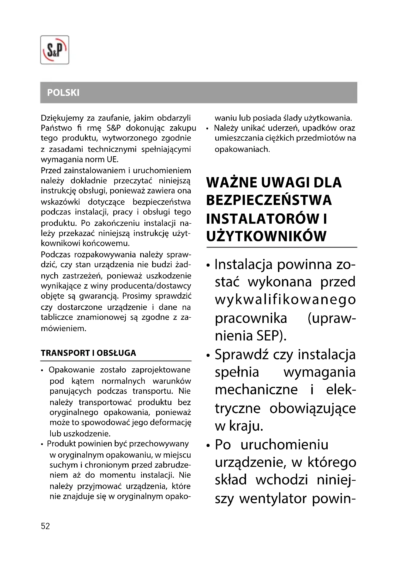 Under henvisning til gælden- de EU lovgivning samt skyldig hensyntagen til kommende generationer bør vi altid gen- anvende udtjente produkter51 hvor det er muligt. Husk at depone- re emballagen i de rigtige genbrugs affaldsspande. Er produktet mærket med dette symbol, skal produktet ved udgangen af dets levetid deponeres på genbrugspladsen i de dertil anviste containere. For enhver tvivl angående S&P produk- terne beder vi Dem rette henvendelse til Den Ofi cielle After Sales Service hvis det er i Spanien, eller den sædvanlige forhandler i andre lande. De kan fi nde disse på WEB siden www.solerpalau. com52 Dziękujemy za zaufanie, jakim obdarzyli Państwo rmę S&P dokonując zakupu tego produktu, wytworzonego zgodnie z zasadami technicznymi spełniającymi wymagania norm UE. Przed zainstalowaniem i uruchomieniem należy dokładnie przeczytać niniejszą instrukcję obsługi, ponieważ zawiera ona wskazówki dotyczące bezpieczeństwa podczas instalacji, pracy i obsługi tego produktu. Po zakończeniu instalacji na- leży przekazać niniejszą instrukcję użyt- kownikowi końcowemu. Podczas rozpakowywania należy spraw- dzić, czy stan urządzenia nie budzi żad- nych zastrzeżeń, ponieważ uszkodzenie wynikające z winy producenta/dostawcy objęte są gwarancją. Prosimy sprawdzić czy dostarczone urządzenie i dane na tabliczce znamionowej są zgodne z za- mówieniem.