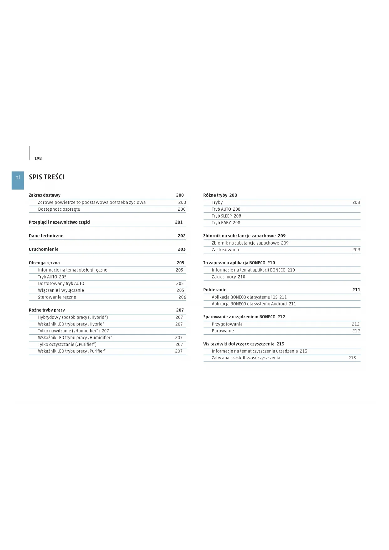 Różne tryby 208 Tryby 208 Tryb AUTO 208 Tryb SLEEP 208 Tryb BABY 208 Zbiornik na substancje zapachowe 209 Zbiornik na substancje zapachowe 209 Zastosowanie 209 To zapewnia aplikacja BONECO 210 Informacje na temat aplikacji BONECO 210 Zakres mocy 210 Pobieranie 211 Aplikacja BONECO dla systemu iOS 211 Aplikacja BONECO dla systemu Android 211 Sparowanie z urządzeniem BONECO 212 Przygotowania 212 Parowanie 212 Wskazówki dotyczące czyszczenia 213 Informacje na temat czyszczenia urządzenia 213 Zalecana częstotliwość czyszczenia 213 Zakres dostawy 200 Zdrowe powietrze to podstawowa potrzeba życiowa 200 Dostępność osprzętu 200 Przegląd i nazewnictwo części 201 Dane techniczne 202 Uruchomienie 203 Obsługa ręczna 205 Informacje na temat obsługi ręcznej 205 Tryb AUTO 205 Dostosowany tryb AUTO 205 Włączanie i wyłączanie 205 Sterowanie ręczne 206 Różne tryby pracy 207 Hybrydowy sposób pracy („Hybrid”) 207 Wskaźnik LED trybu pracy „Hybrid” 207 Tylko nawilżanie („Humidifier”) 207 Wskaźnik LED trybu pracy „Humidifier” 207 Tylko oczyszczanie („Purifier”) 207 Wskaźnik LED trybu pracy „Purifier” 207199