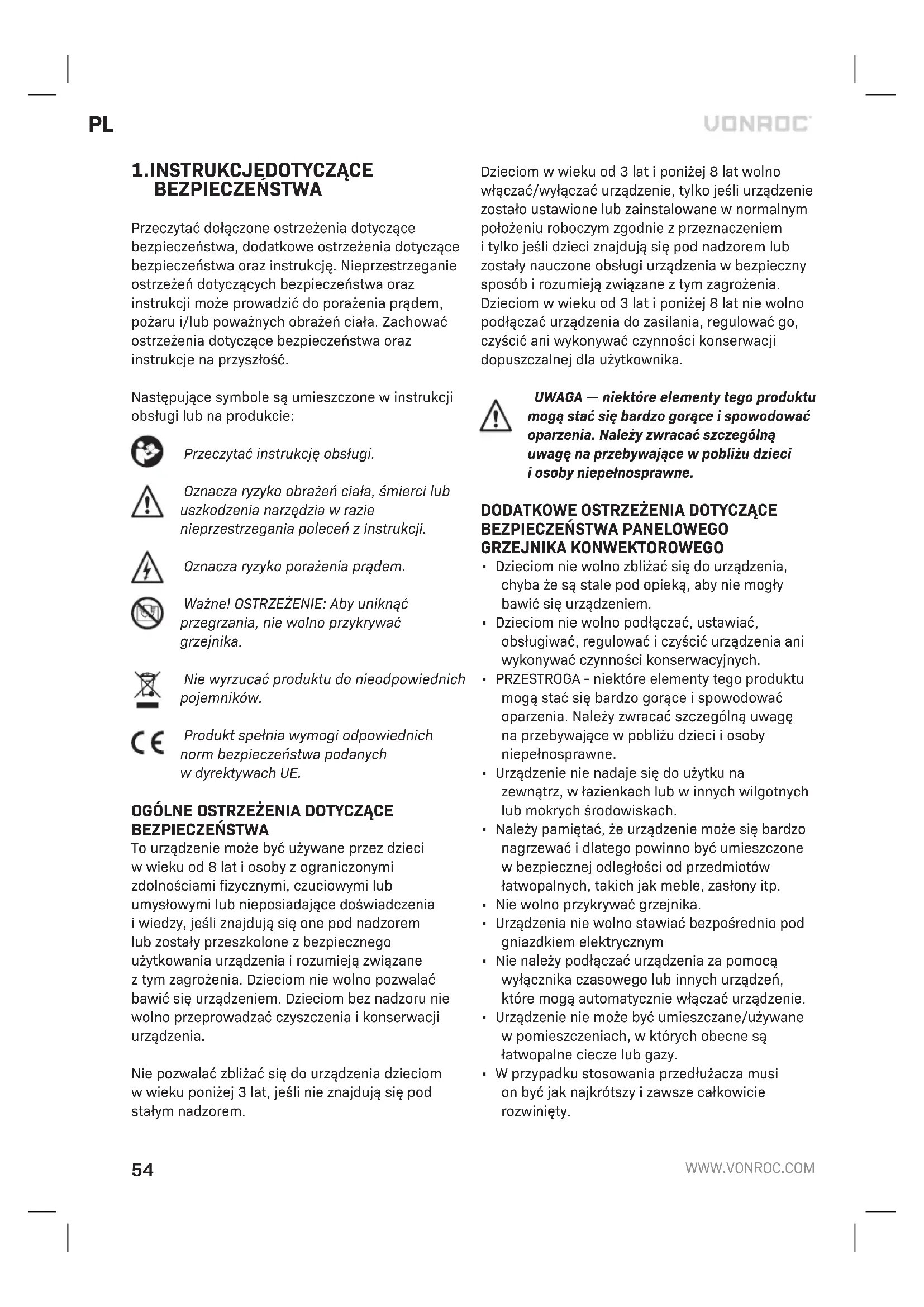 BEZPIECZEŃSTWA Przeczytać dołączone ostrzeżenia dotyczące bezpieczeństwa, dodatkowe ostrzeżenia dotyczące bezpieczeństwa oraz instrukcję. Nieprzestrzeganie ostrzeżeń dotyczących bezpieczeństwa oraz instrukcji może prowadzić do porażenia prądem, pożaru i/lub poważnych obrażeń ciała. Zachować ostrzeżenia dotyczące bezpieczeństwa oraz instrukcje na przyszłość. Następujące symbole są umieszczone winstrukcji obsługi lub na produkcie: Przeczytać instrukcję obsługi. Oznacza ryzyko obrażeń ciała, śmierci lub uszkodzenia narzędzia wrazie nieprzestrzegania poleceń zinstrukcji. Oznacza ryzyko porażenia prądem. Ważne! OSTRZEŻENIE: Aby uniknąć przegrzania, nie wolno przykrywać grzejnika. Nie wyrzucać produktu do nieodpowiednich pojemników. Produkt spełnia wymogi odpowiednich norm bezpieczeństwa podanych wdyrektywach UE.