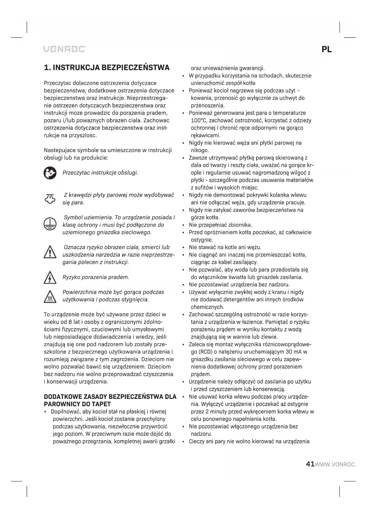Z urządzenia przez zawór bezpieczeństwa wydo- staje się para Zawór bezpieczeństwa to specjalny zawór nisko- ciśnieniowy i nie można go zastępować żadnymi innym zaworem. Jeśli z zaworu wycieka para, najprawdopodobniej doszło do zatkania węża. Po- czekać na ostygnięcie węża, odłączyć go ispraw- dzić, czy nie jest zatkany. Zawsze sprawdzać wlot wużywanym urządzeniu. Pod żadnym pozorem nie zamykać zaworu na siłę. Zawór działa, by zapewnić bezpieczeństwo użytkownikowi. SRODOWISKO Uszkodzone i/lub niepotrzebne urzadzenia elektryczne lub elektroniczne podlegaja zbiórce w odpowiednich punktach recyklingu. Tylko kraje WE Nie wyrzucac elektronarzedzi wraz z odpadami z gospodarstw domowych. Zgodnie z dyrektywa 2012/19/EU dotyczaca zuzytych urzadzen elek- trycznych i elektronicznych oraz jej wdrozeniem do prawodawstwa krajowego, elektronarzedzia, które juz nie nadaja sie do uzytku, podlegaja oddzielnej zbiórce oraz utylizacji w sposób przy- jazny dla srodowiska. GWARANCJA Produkty VONROC są wytwarzane zgodnie z najwyż- szymi standardami jakości i producent udziela gwarancji na wady materiałowe i wady wykonania na okres wymagany prawem, licząc od dnia zaku- pu. Jeśli wystąpi usterka produktu w tym okresie spowodowana wadą materiałową i/lub wadą wykonania, proszę bezpośrednio skontaktować się ze sprzedawcą VONROC. Następujące okoliczności powodują unieważnienie gwarancji:
