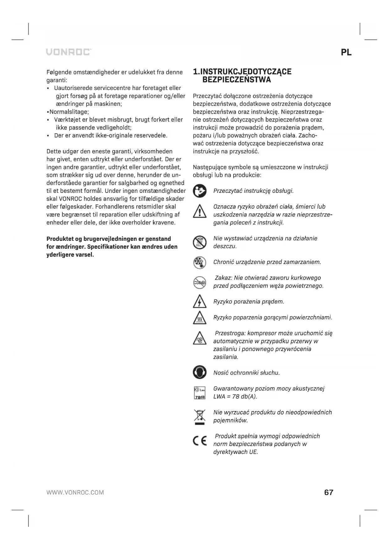 - Czy dostępne jest zasilanie elektryczne (pra- widłowo podłączona wtyczka, nieuszkodzone bezpieczniki termiczno-magnetyczne). Kompresor nie wyłącza się Jeśli kompresor nie wyłączy się po osiągnięciu maksymalnego ciśnienia, uruchomi się zawór bezpieczeństwa zbiornika. W razie potrzeby skon- taktować się z autoryzowanym serwisem w celu naprawy. ŚRODOWISKO Uszkodzone lub niepotrzebne urządzenia elektryczne lub elektroniczne podlegają zbiórce w odpowiednich punktach recyklingu. Tylko kraje UE Nie wyrzucac elektronarzedzi wraz z odpadami z gospodarstw domowych. Zgodnie z dyrektywa 2012/19/EU dotyczaca zuzytych urzadzen elektrycz- nych i elektronicznych oraz jej wdrozeniem do prawo- dawstwa krajowego, elektronarzedzia, które juz nie nadaja sie do uzytku, podlegaja oddzielnej zbiórce oraz utylizacji w sposób przyjazny dla srodowiska. GWARANCJA Produkty VONROC są wytwarzane zgodnie z naj- wyższymi standardami jakości i producent udziela gwarancji na wady materiałowe i wady wykonania na okres wymagany prawem, licząc od dnia zaku- pu. Jeśli wystąpi usterka produktu w tym okresie spowodowana wadą materiałową i/lub wadą wykonania, proszę bezpośrednio skontaktować się ze sprzedawcą VONROC. Następujące okoliczności powodują unieważnienie gwarancji:
