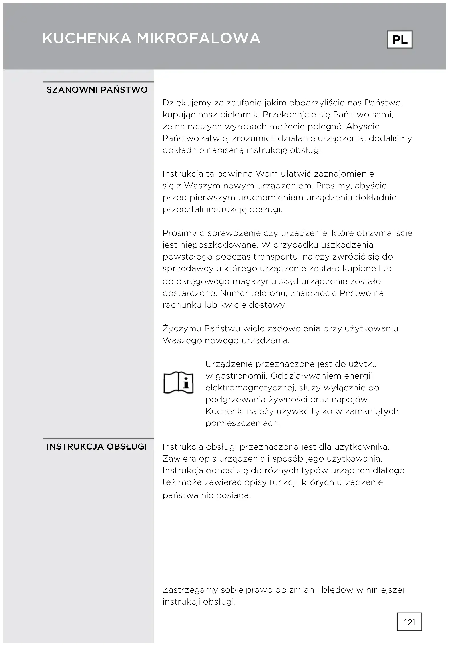 Dziękujemy za zaufanie jakim obdarzyliście nas Państwo, kupując nasz piekarnik. Przekonajcie się Państwo sami, że na naszych wyrobach możecie polegać. Abyście Państwo łatwiej zrozumieli działanie urządzenia, dodaliśmy dokładnie napisaną instrukcję obsługi. Instrukcja ta powinna Wam ułatwić zaznajomienie się z Waszym nowym urządzeniem. Prosimy, abyście przed pierwszym uruchomieniem urządzenia dokładnie przecztali instrukcję obsługi. Prosimy o sprawdzenie czy urządzenie, które otrzymaliście jest nieposzkodowane. W przypadku uszkodzenia powstałego podczas transportu, należy zwrócić się do sprzedawcy u którego urządzenie zostało kupione lub do okręgowego magazynu skąd urządzenie zostało dostarczone. Numer telefonu, znajdziecie Pństwo na rachunku lub kwicie dostawy. Życzymu Państwu wiele zadowolenia przy użytkowaniu Waszego nowego urządzenia. Urządzenie przeznaczone jest do użytku w gastronomii. Oddziaływaniem energii elektromagnetycznej, służy wyłącznie do podgrzewania żywności oraz napojów. Kuchenki należy używać tylko w zamkniętych pomieszczeniach. Instrukcja obsługi przeznaczona jest dla użytkownika. Zawiera opis urządzenia i sposób jego użytkowania. Instrukcja odnosi się do różnych typów urządzeń dlatego też może zawierać opisy funkcji, których urządzenie państwa nie posiada. Zastrzegamy sobie prawo do zmian i błędów w niniejszej instrukcji obsługi.