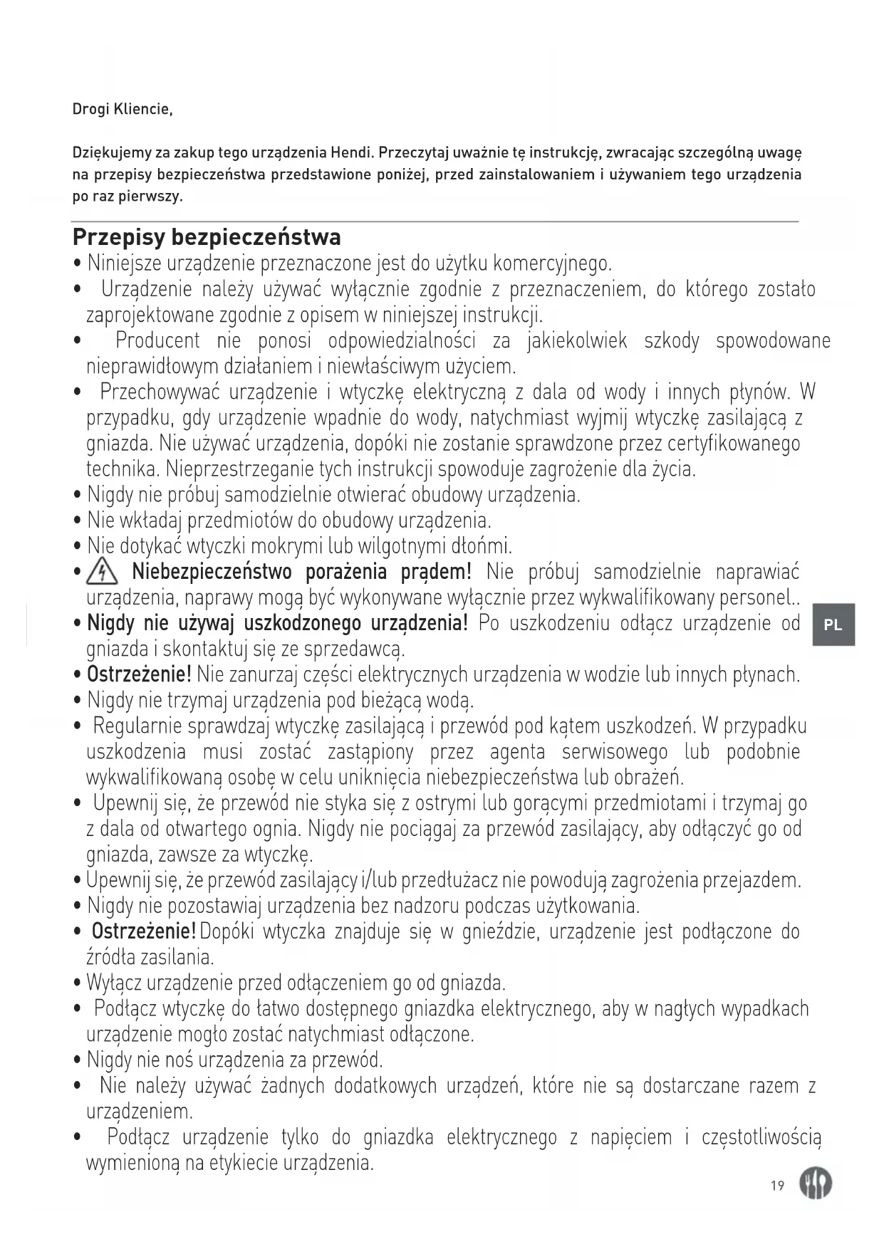 Drogi Kliencie, Dziękujemy za zakup tego urządzenia Hendi. Przeczytaj uważnie tę instrukcję, zwracając szczególną uwagę na przepisy bezpieczeństwa przedstawione poniżej, przed zainstalowaniem i używaniem tego urządzenia po raz pierwszy. Przepisy bezpieczeństwa