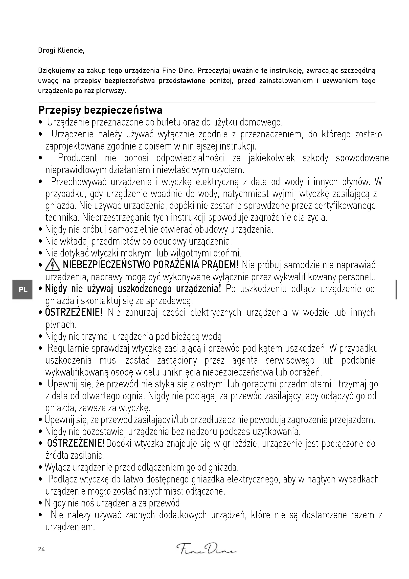 Drogi Kliencie, Dziękujemy za zakup tego urządzenia Fine Dine. Przeczytaj uważnie tę instrukcję, zwracając szczególną uwagę na przepisy bezpieczeństwa przedstawione poniżej, przed zainstalowaniem i używaniem tego urządzenia po raz pierwszy. Przepisy bezpieczeństwa