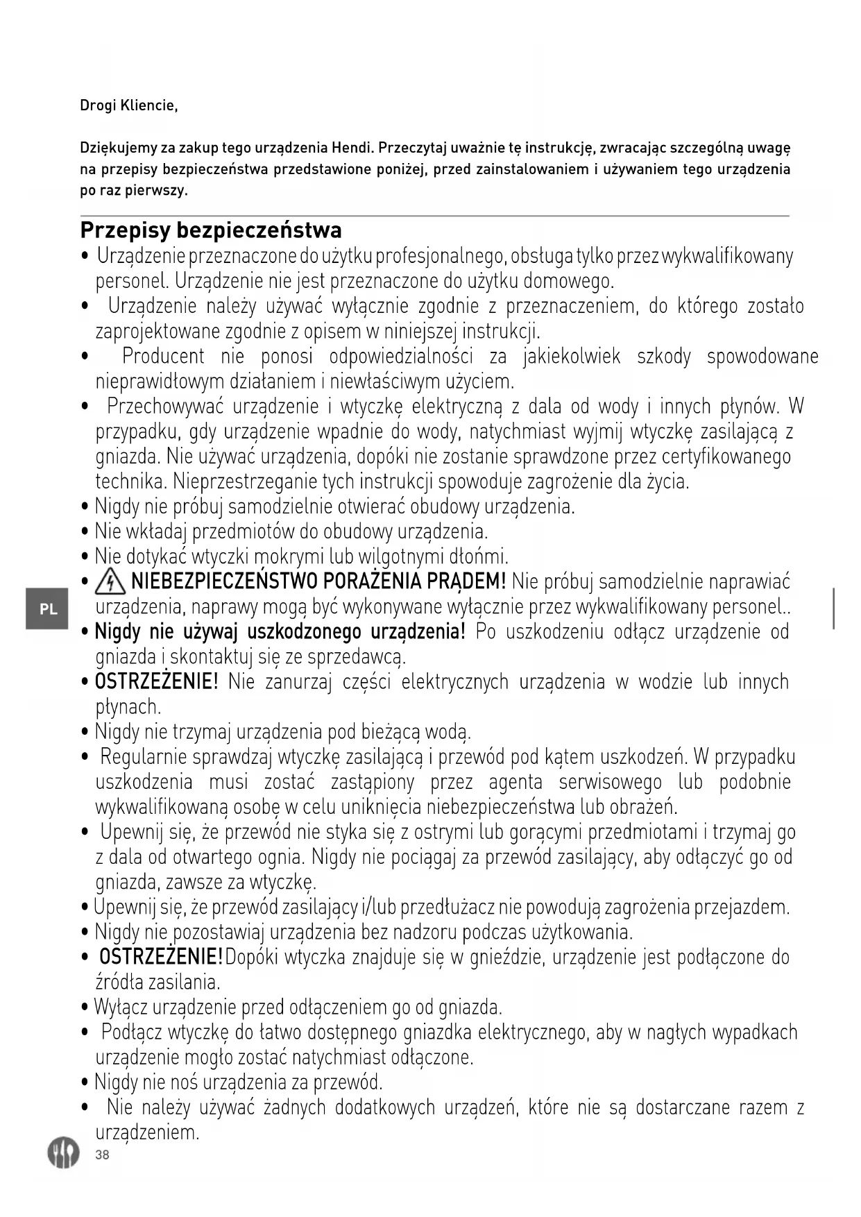 Drogi Kliencie, Dziękujemy za zakup tego urządzenia Hendi. Przeczytaj uważnie tę instrukcję, zwracając szczególną uwagę na przepisy bezpieczeństwa przedstawione poniżej, przed zainstalowaniem i używaniem tego urządzenia po raz pierwszy. Przepisy bezpieczeństwa