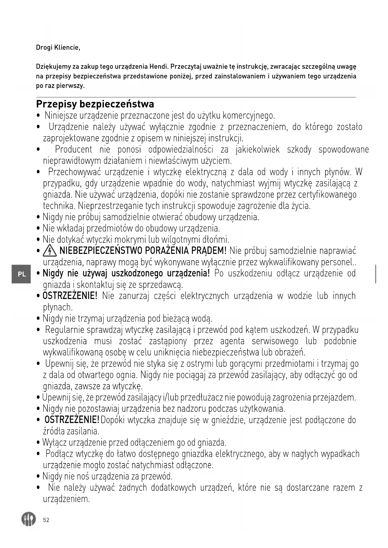 Dziekujemy za zakup unto urzadzenia Hendi. Przechytaj uwaznie te instrukcje, zwracajc szczeuglna uwage na przypisy bezpieczne sta przdastwione ponizej, przyzastalowaniem i uzywaniem unto urzadzenia po raz pierwszy.