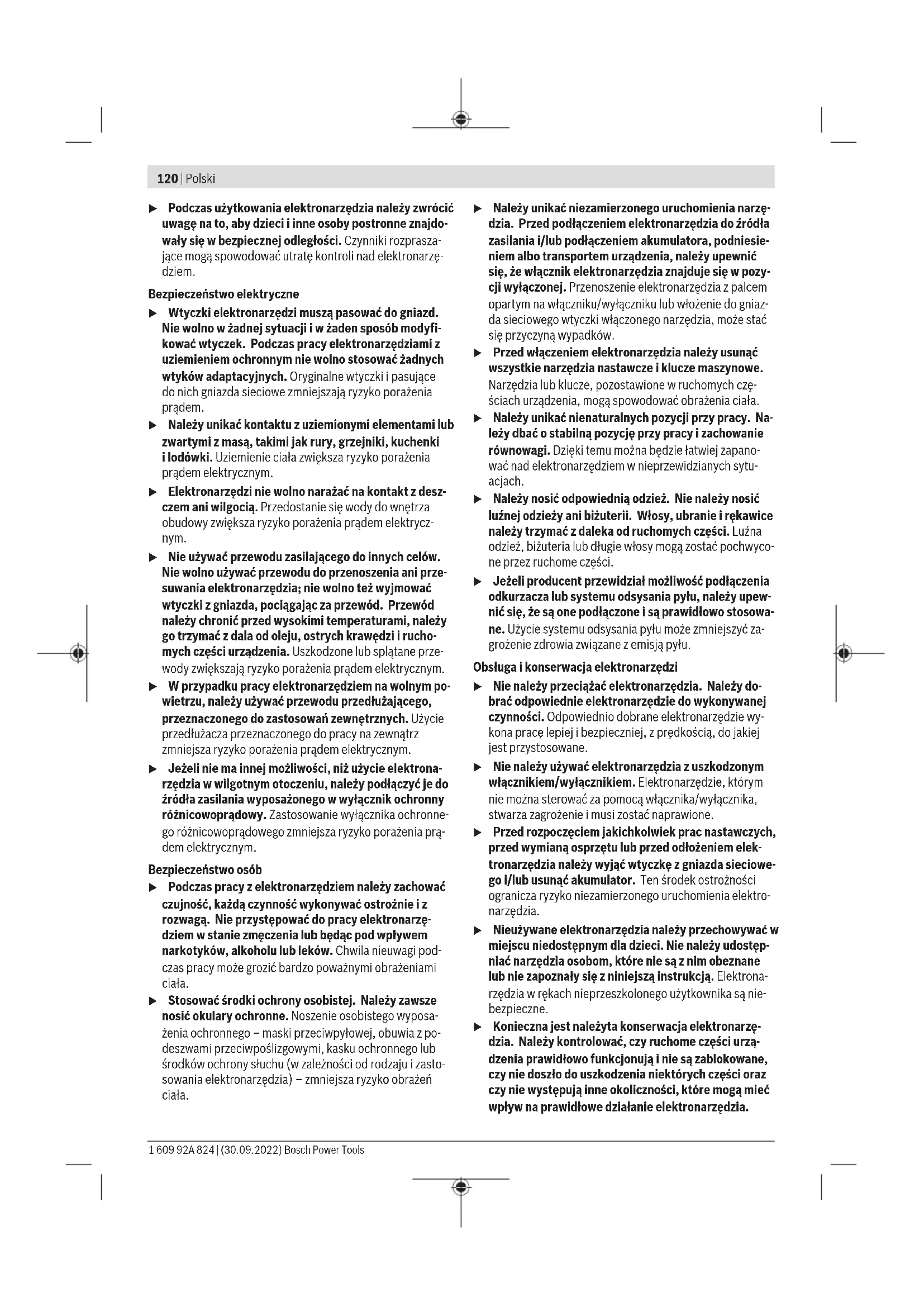 Karasoku Mahallesi 28028. Sokak No:20/A Merkez / ADANA Tel.: +903223599710 -3521379 Fax: +903223591323 E-mail: isiklar@isiklarelektrik.com Diğer servis adreslerini şurada bulabilirsiniz: www.bosch-pt.com/serviceaddresses Tasfiye Elektrikli el aleti, aksesuar ve ambalaj malzemesi çevre dostu bir yöntemle tasfiye edilmek üzere tekrar kazanım merkezine gönderilmelidir. Elektrikli el aletlerini evsel çöplerin içine atmayın! Sadece AB ülkeleri için: Eski elektrikli el aletleri ve elektronik aletlere ilişkin 2012/19/EU sayılı Avrupa Birliği yönetmeliği ve bunların tek tek ülkelerin hukuklarına uyarlanması uyarınca, kullanım ömrünü tamamlamış elektrikli el aletleri ayrı ayrı toplanmak ve çevre dostu bir yöntemle tasfiye edilmek üzere yeniden kazanım merkezlerine gönderilmek zorundadır. Atık elektrikli ve elektronik ekipmanlar uygun şekilde imha edilmezse olası tehlikeli maddelerin varlığı nedeniyle çevre ve insan sağlığı üzerinde zararlı etkileri olabilir. Polski Wskazówki bezpieczeństwa Ogólne zasady bezpieczeństwa podczas pracy z elektronarzędziami OSTRZEŻENIE Należy przeczytać wszystkie ostrzeżenia i wskazówki. Nieprze- strzeganie poniższych ostrzeżeń i wskazówek może stać się przyczyną porażenia prądem elektrycznym, pożaru i/lub po- ważnych obrażeń ciała. Należy zachować wszystkie ostrzeżenia i wskazówki dla dalszego zastosowania. Pojęcie "elektronarzędzie" odnosi się do elektronarzędzi za- silanych energią elektryczną z sieci (z przewodem zasilają- cym) i do elektronarzędzi zasilanych akumulatorami (bezprzewodu zasilającego). Bezpieczeństwo w miejscu pracy u Miejsce pracy należy utrzymywać w czystości i zapew- nić dobre oświetlenie. Nieporządek i brak właściwego oświetlenia sprzyjają wypadkom. u Elektronarzędzi nie należy używać w środowiskach za- grożonym wybuchem, np. w pobliżu łatwopalnych cie- czy, gazów lub pyłów. Podczas pracy elektronarzędziem wytwarzają się iskry, które mogą spowodować zapłon py- łów lub oparów. Bosch Power Tools 1 609 92A 824 | (30.09.2022)120 | Polski u Podczas użytkowania elektronarzędzia należy zwrócić uwagę na to, aby dzieci i inne osoby postronne znajdo- wały się w bezpiecznej odległości. Czynniki rozprasza- jące mogą spowodować utratę kontroli nad elektronarzę- dziem. Bezpieczeństwo elektryczne u Wtyczki elektronarzędzi muszą pasować do gniazd. Nie wolno w żadnej sytuacji i w żaden sposób modyfi- kować wtyczek. Podczas pracy elektronarzędziami z uziemieniem ochronnym nie wolno stosować żadnych wtyków adaptacyjnych. Oryginalne wtyczki i pasujące do nich gniazda sieciowe zmniejszają ryzyko porażenia prądem. u Należy unikać kontaktu z uziemionymi elementami lub zwartymi z masą, takimi jak rury, grzejniki, kuchenki ilodówki. Uziemienie ciała zwiększa ryzyko porażenia prądem elektrycznym. u Elektronarzędzi nie wolno narażać na kontakt z desz- czem ani wilgocią. Przedostanie się wody do wnętrza obudowy zwiększa ryzyko porażenia prądem elektrycz- nym. u Nie używać przewodu zasilającego do innych celów. Nie wolno używać przewodu do przenoszenia ani prze- suwania elektronarzędzia; nie wolno też wyjmować wtyczki z gniazda, pociągając za przewód. Przewód należy chronić przed wysokimi temperaturami, należy go trzymać zdala od oleju, ostrych krawędzi i rucho- mych części urządzenia. Uszkodzone lub splątane prze- wody zwiększają ryzyko porażenia prądem elektrycznym. u W przypadku pracy elektronarzędziem na wolnym po- wietrzu, należy używać przewodu przedłużającego, przeznaczonego do zastosowań zewnętrznych. Użycie przedłużacza przeznaczonego do pracy na zewnątrz zmniejsza ryzyko porażenia prądem elektrycznym. u Jeżeli nie ma innej możliwości, niż użycie elektrona- rzędzia w wilgotnym otoczeniu, należy podłączyć je do źródła zasilania wyposażonego w wyłącznik ochronny różnicowoprądowy. Zastosowanie wyłącznika ochronne- go różnicowoprądowego zmniejsza ryzyko porażenia prą- dem elektrycznym. Bezpieczeństwo osób u Podczas pracy z elektronarzędziem należy zachować czujność, każdą czynność wykonywać ostrożnie i z rozwagą. Nie przystępować do pracy elektronarzę- dziem w stanie zmęczenia lub będąc pod wpływem narkotyków, alkoholu lub leków. Chwila nieuwagi pod- czas pracy może grozić bardzo poważnymi obrażeniami ciała. u Stosować środki ochrony osobistej. Należy zawsze nosić okulary ochronne. Noszenie osobistego wyposa- żenia ochronnego – maski przeciwpyłowej, obuwia zpo- deszwami przeciwpoślizgowymi, kasku ochronnego lub środków ochrony słuchu (w zależności od rodzaju i zasto- sowania elektronarzędzia) – zmniejsza ryzyko obrażeń ciała. u Należy unikać niezamierzonego uruchomienia narzę- dzia. Przed podłączeniem elektronarzędzia do źródła zasilania i/lub podłączeniem akumulatora, podniesie- niem albo transportem urządzenia, należy upewnić się, że włącznik elektronarzędzia znajduje się w pozy- cji wyłączonej. Przenoszenie elektronarzędzia z palcem opartym na włączniku/wyłączniku lub włożenie do gniaz- da sieciowego wtyczki włączonego narzędzia, może stać się przyczyną wypadków. u Przed włączeniem elektronarzędzia należy usunąć wszystkie narzędzia nastawcze i klucze maszynowe. Narzędzia lub klucze, pozostawione wruchomych czę- ściach urządzenia, mogą spowodować obrażenia ciała. u Należy unikać nienaturalnych pozycji przy pracy. Na- leży dbać o stabilną pozycję przy pracy i zachowanie równowagi. Dzięki temu można będzie łatwiej zapano- wać nad elektronarzędziem w nieprzewidzianych sytu- acjach. u Należy nosić odpowiednią odzież. Nie należy nosić luźnej odzieży ani biżuterii. Włosy, ubranie i rękawice należy trzymać zdaleka od ruchomych części. Luźna odzież, biżuteria lub długie włosy mogą zostać pochwyco- ne przez ruch