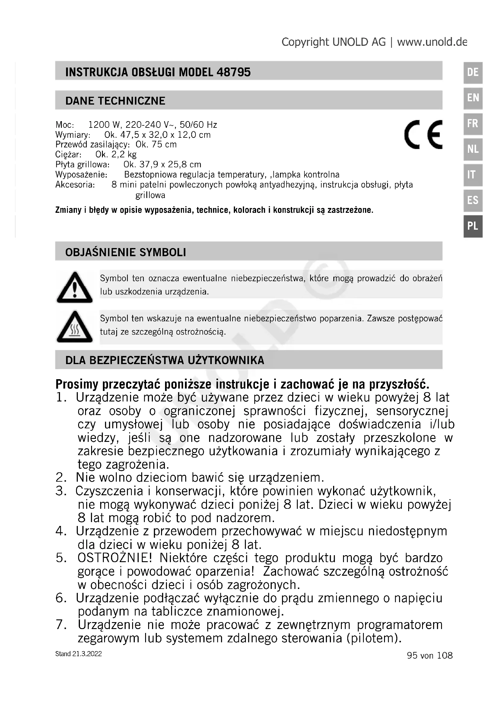Symbol ten oznacza ewentualne niebezpieczeństwa, które mogą prowadzić do obrażeń lub uszkodzenia urządzenia. Symbol ten wskazuje na ewentualne niebezpieczeństwo poparzenia. Zawsze postępować tutaj ze szczególną ostrożnością. Copyright UNOLD AG | www.unold.de UNOLD ©96 von 108 Stand 21.3.2022