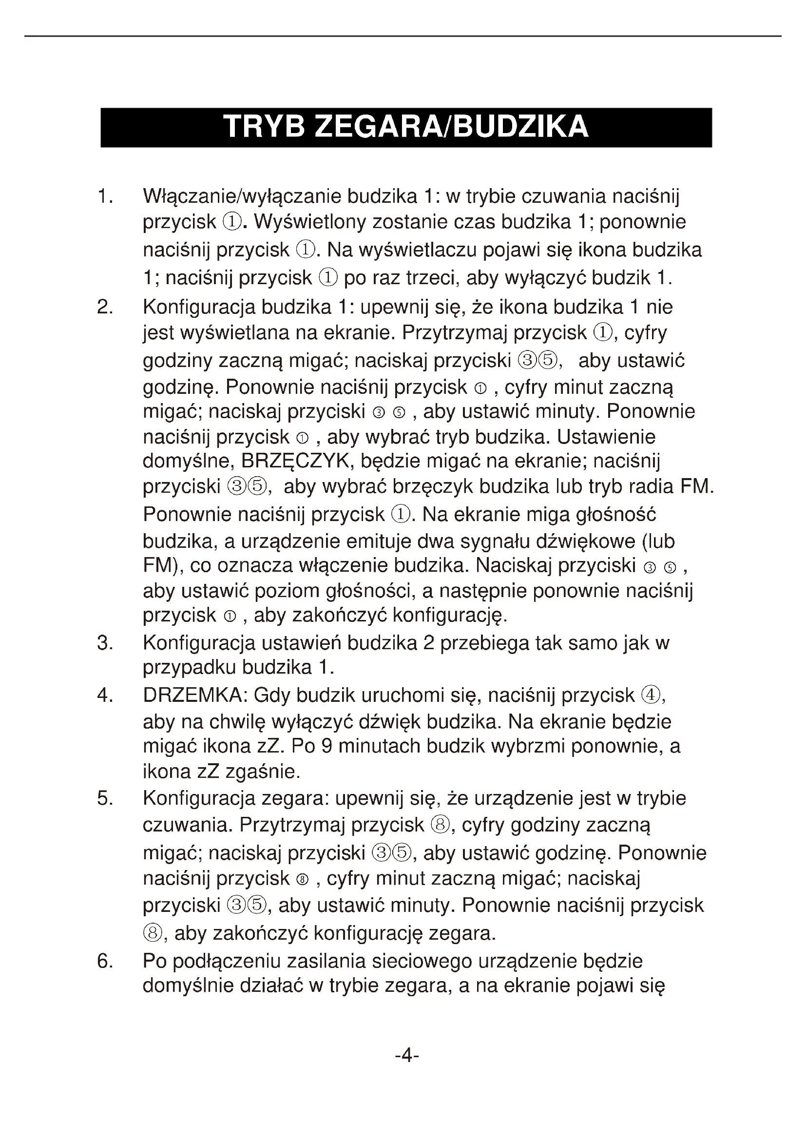 - Konfiguracja budzika 1: upewnij są, ze ikona budzika 1Nie jest wyświetlana na ekranie. Przytrzymaj przycisk ①, cyfry godziny zacznych migać; naciskaj przyciski ③⑤, aby ustawić godzine. Ponownie nacijsnij przycisk ①, cyfry minut zacznych migać; naciskaj przyciski ③ ⑤, aby ustawić minuty. Ponownie nacijsnij przycisk ①, aby wybrać tryb budzika. Ustawienie domyslne, BRZECZYK,;będzie migać na ekranie; nacijsnij przyciski ③⑤,aby wybrać bręcznych budzika lub tryb radia FM. Ponownie nacijsnij przycisk ①. Na ekranie miga głowosność budzika, a urzadzenia emituje dwa sygnalu dzwiekowej (lub FM), co oznacza wączenia budzika. Naciskaj przyciski ③ ⑤,aby ustawić poziom głowosnosci, a nakropnie ponownie nacijsnij przycisk ①,aby zakończyć konfiguracja.