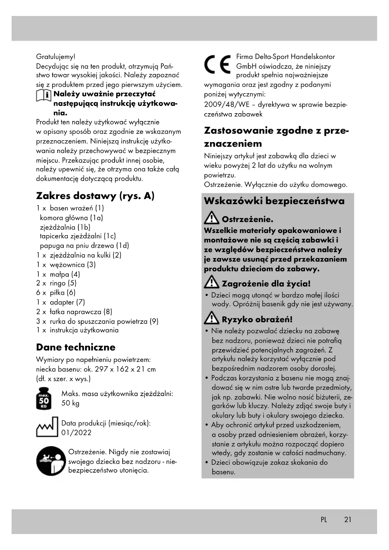 - Aby ochronić artykuł przed uszkodzeniem, a osoby przed odniesieniem obrażeń, korzy- stanie z artykułu można rozpocząć dopiero wtedy, gdy zostanie w całości nadmuchany.