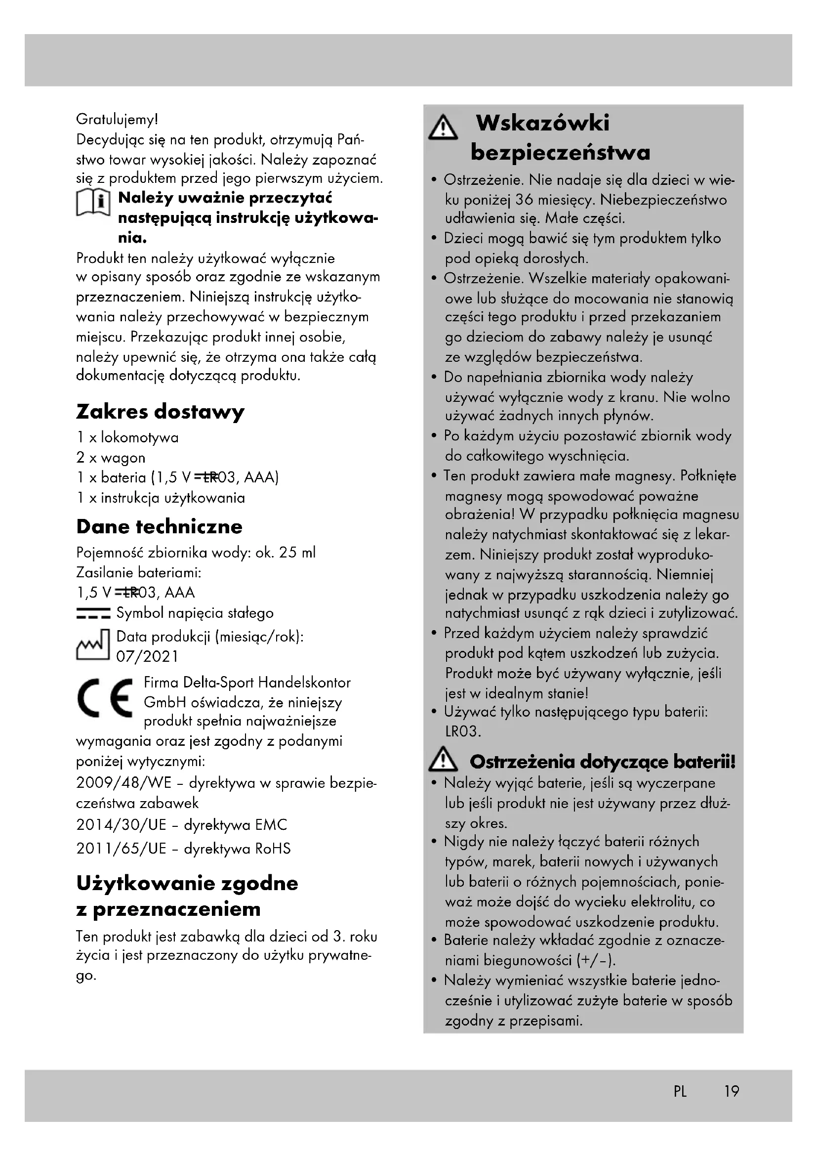 gon. Wskazówka: wsunąć zbiornik wody do wa- gonu pokrywą do przodu. Funkcja obrotu wagonu Gdy pociąg porusza się do przodu, kółka zęba- te wagonu są wprawiane w ruch oraz aktywo- wana jest funkcja obrotu. PL21PL Przechowywanie, czyszczenie Podczas nieużywania należy zawsze przechowywać produkt w suchym i czystym miejscu, z wyjętymi bateriami, w temperaturze pokojowej. Zawsze po zakończeniu zabawy opróżniać całkowicie zbiornik wody i wyczyścić go, jeśli nie był używany przez dłuższy czas. Wycierać do czysta jedynie suchą ściereczką. WAŻNE! Nie czyścić przy użyciu ostrych środków czyszczących. Uwagi odnośnie recyklingu Jeśli produkt jest zużyty, nie należy go wyrzucać wraz z odpadami domowymi ze względu na ochronę środowiska, ale należy go odpowiednio zutylizować. Informacje o punktach zbiórki i godzinach otwarcia można uzyskać w lokalnej administracji. Uszkodzone lub zużyte baterie/akumulatory należy poddać recyklingowi zgodnie z dyrek- tywą 2006/66/WE i jej zmianami. Zwrócić baterie/akumulatory i/lub produkt, korzystając z udostępnionych urządzeń przeznaczonych do zbiórki. Opakowania, takie jak torby plastikowe, nie powinny znaleźć się w rękach dzieci. Opakowanie przechowywać w miejscu niedostępnym dla dzieci. Nieprawidłowa utylizacja baterii/ akumulatorów wyrządza szkody w środowisku naturalnym! Baterii/ akumulatorów nie wolno wyrzucać razem z odpadami domowymi. Mogą zawierać toksyczne metale ciężkie i podlegają obróbce odpadów niebezpiecznych. Symbole chemiczne metali ciężkich są następujące: Cd = kadm, Hg = rtęć, Pb = ołów. Zużyte baterie/akumulato- ry należy oddawać w miejskim punkcie zbiórki. Produkt oraz opakowanie należy utylizować w sposób przyjazny dla środowiska. Przestrzegać oznakowania materiałów opakowaniowych podczas segregacji odpadów. Są one oznaczone skrótami (a) i liczbami (b) o następującym znaczeniu: 1–7: tworzywa sztuczne/20–22: papier i karton/80–98: materiały kompozytowe. Produkt i materiały opakowaniowe nadają się do recyklingu, należy je osobno zutylizować w celu lepszego przetwarzania odpadów. Logo Triman obowiązuje tylko we Francji. Informacje o sposobie utylizacji zużytego produktu są dostępne u władz lokalnych lub miejskich. Wskazówki dotyczące gwa- rancji i obsługi serwisowej Artykuł został wyprodukowany z najwyższą starannością i pod stałą kontrolą. DELTA-SPORT HANDELSKONTOR GmbH przyznaje klien- towi końcowemu na niniejszy artykuł trzy lata gwarancji od daty zakupu (okres gwarancyjny) z zastrzeżeniem poniższych postanowień. Gwa- rancja dotyczy wyłącznie wad materiałowych i wad wykonania. Gwarancja nie obejmuje części, które podlegają normalnemu zużyciu i z tego względu należy je traktować jako części zużywalne (np. baterie) i nie obejmuje części kruchych, np. przełączników, akumulatorów ani części wykonanych ze szkła. Wyklucza się rosz- czenia z tytułu niniejszej gwarancji w przypadku użycia artykułu w sposób niewłaściwy lub sprzeczny z jego przeznaczeniem lub w sposób wykraczający poza przewidziane przeznacze- nie lub poza przewidziany zakres użytkowania lub jeśli wytyczne zawarte w instrukcji obsługi nie były przestrzegane, chyba że klient końcowy udowodni istnienie wady materiałowej lub wady wykonania, która nie wynika z podanych wyżej przyczyn. Roszczenia z tytułu gwarancji można zgłaszać wyłącznie w okresie gwarancyjnym za okazaniem oryginalnego dowodu zakupu. Prosimy zatem zachować oryginalny dowód zakupu! W przypadku jakichkolwiek reklamacji prosimy skontaktować się z nami najpierw za pośrednictwem podanej poniżej infolinii serwiso- wej lub drogą e-mailową. W przypadku objętym gwarancją artykuł zostanie – według naszego uznania – bezpłatnie naprawiony, wymieniony lub nastąpi zwrot ceny zakupu. Z gwarancji nie wynikają żadne inne prawa. Niniejsza gwaran- cja nie ogranicza Państwa ustawowych praw, w szczególności roszczeń gwarancyjnych wobec danego sprzedawcy.22 W przypadku wymiany części lub całego arty- kułu okres gwarancji przedłuża się o trzy lata zgodnie z art. 581 § 1 kodeksu cywilnego. Po upłynięciu czasu gwarancji powstałe naprawy są płatne. IAN: 359779_2101 Serwis Polska Tel.: 22 397 4996 E-Mail: deltasport@lidl.pl PL23 Srdečně blahopřejeme! Svým nákupem jste se rozhodli pro kvalitní výro- bek. Před prvním použitím se prosím seznamte s tímto výrobkem. Pozorně si přečtete následující návod k použití. Používejte tento výrobek pouze tak, jak je popsáno, a pro uvedené účely. Uschovejte si tento návod k použití pro budoucí použití. Pokud výrobek předáte třetí osobě, předejte jí i veške- rou dokumentaci. Obsah balení 1 x lokomotiva 2 x vagón 1 x baterie (1,5 V LR03, AAA) 1 x návod k použití Technické údaje Objem nádrže na vodu: cca 25 ml Zdroj energie (baterie): 1,5 V LR03, AAA Symbol pro stejnosměrné napětí Datum výroby (měsíc/rok): 07/2021 Společnost Delta-Sport Handelskon- tor GmbH tímto prohlašuje, že tento výrobek je v souladu s následujícími základními požadavky a ostatními příslušnými ustanoveními: 2009/48/ES – Směrnice o bezpečnosti hraček 2014/30/EU – Směrnice o EMK 2011/65/EU – Směrnice RoHS Použití dle určení Tento výrobek je hračka pro děti od 3 let, je určen jen pro soukromé použití. Bezpečnostní pokyny