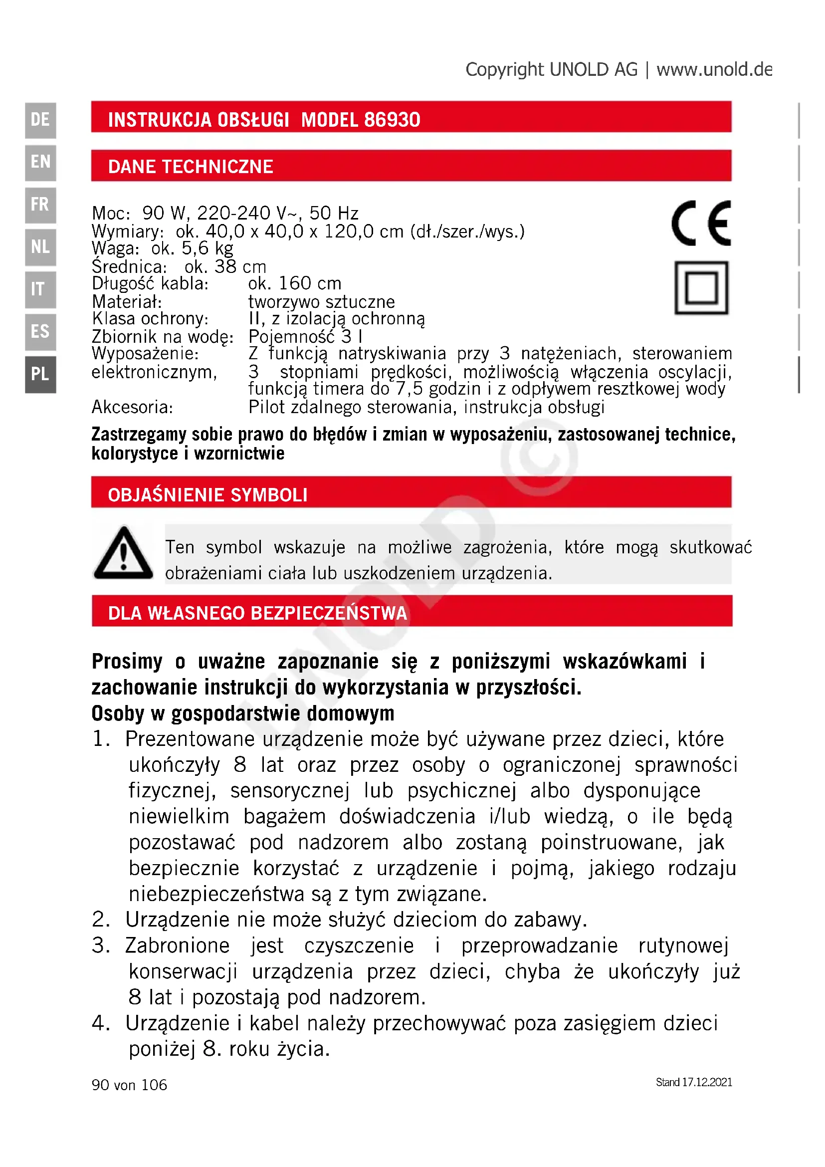 Moc: 90 W, 220-240 V~, 50 Hz Wymiary: ok. 40,0 x 40,0 x 120,0 cm (dł./szer./wys.) Waga: ok. 5,6 kg Średnica: ok. 38 cm Długość kabla: ok. 160 cm Materiał: tworzywo sztuczne Klasa ochrony: II, z izolacją ochronną Zbiornik na wodę: Pojemność 3 l Wyposażenie: Z funkcją natryskiwania przy 3 natężeniach, sterowaniem elektronicznym, 3 stopniami prędkości, możliwością włączenia oscylacji, funkcją timera do 7,5 godzin i z odpływem resztkowej wody Akcesoria: Pilot zdalnego sterowania, instrukcja obsługi Zastrzegamy sobie prawo do błędów i zmian w wyposażeniu, zastosowanej technice, kolorystyce i wzornictwie Copyright UNOLD AG | www.unold.de UNOLD ©Stand 17.12.2021 91 von 106