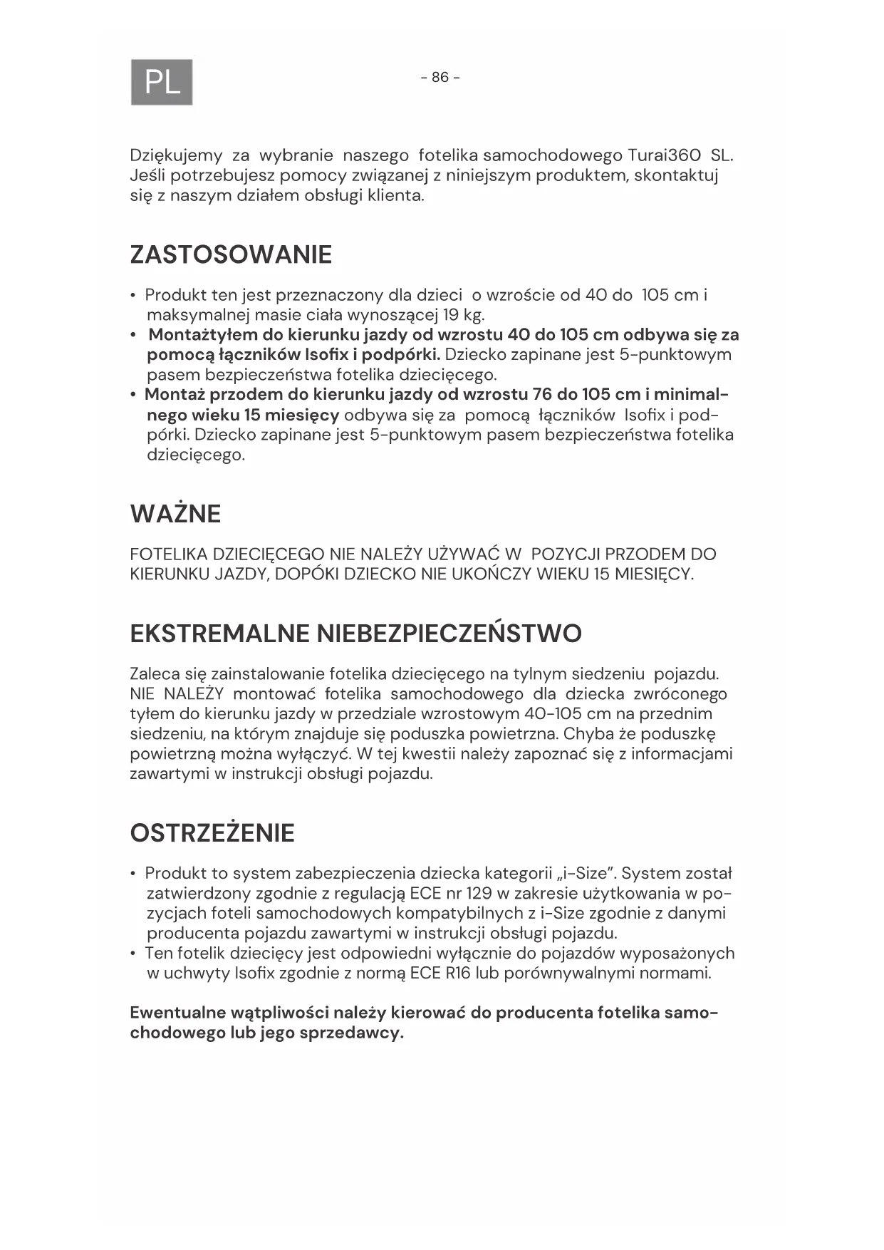 Dziękujemy za wybranie naszego fotelika samochodowego Turai360 SL. Jeśli potrzebujesz pomocy związanej z niniejszym produktem, skontaktuj się z naszym działem obsługi klienta. ZASTOSOWANIE