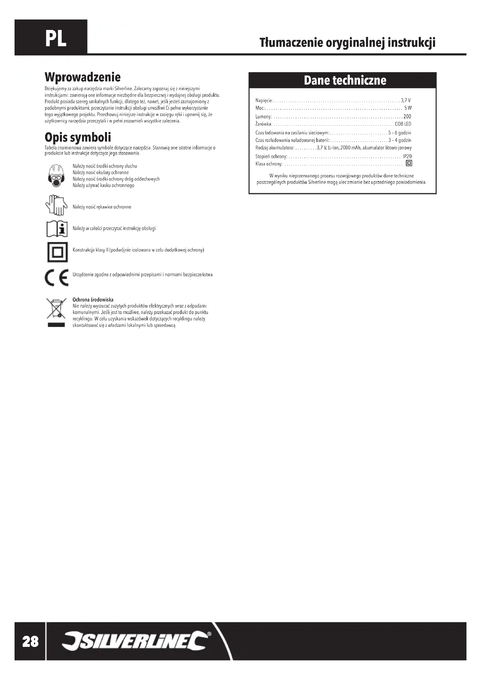 Opis symboli Tabelaznamionowazawierasymboledotyczącenarzędzia.Stanowiąoneistotneinformacjeoprodukcielubinstrukcjedotyczącejegostosowania.Należynosićśrodkiochronysłuchu Należynosićokularyochronne Należynosićśrodkiochronydrógoddechowych NależyużywaćkaskuochronnegoNależynosićrękawiceochronneNależywcałościprzeczytaćinstrukcjęobsługiKonstrukcja klasy II (podwójnie izolowana w celu dodatkowej ochrony)UrządzeniezgodnezodpowiednimiprzepisamiinormamibezpieczeństwaOchrona środowiska Nienależywyrzucaćzużytychproduktówelektrycznychwrazzodpadamikomunalnymi.Jeślijesttomożliwe,należyprzekazaćproduktdopunkturecyklingu.Wceluuzyskaniawskazówekdotyczącychrecyklingunależyskontaktowaćsięzwładzamilokalnymilubsprzedawcą Wprowadzenie DziękujemyzazakupnarzędziamarkiSilverline.Zalecamyzapoznajsięzniniejszymiinstrukcjami:zawierająoneinformacjeniezbędnedlabezpiecznejiwydajnejobsługiproduktu.Produktposiadaszeregunikalnychfunkcji,dlategoteż,nawet,jeślijesteśzaznajomionyzpodobnymiproduktami,przeczytanieinstrukcjiobsługiumożliwiCipełnewykorzystanietegowyjątkowegoprojektu.Przechowujniniejszeinstrukcjewzasięgurękiiupewnijsię,żeużytkownicynarzędziaprzeczytaliiwpełnizrozumieliwszystkiezalecenia.