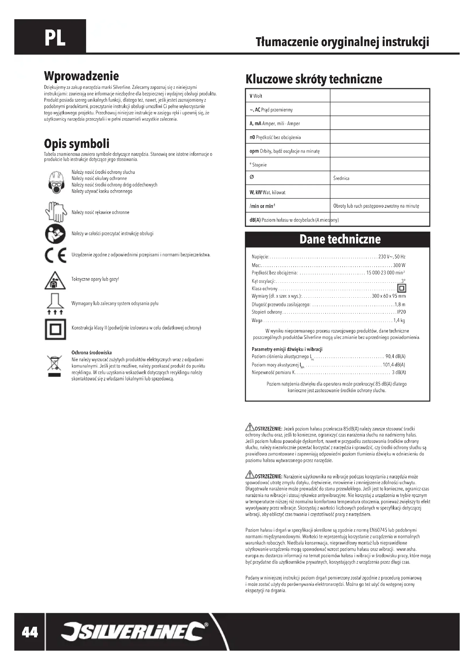 Opis symboli Tabelaznamionowazawierasymboledotyczącenarzędzia.Stanowiąoneistotneinformacjeoprodukcielubinstrukcjedotyczącejegostosowania.Należynosićśrodkiochronysłuchu Należynosićokularyochronne Należynosićśrodkiochronydrógoddechowych NależyużywaćkaskuochronnegoNależynosićrękawiceochronneNależywcałościprzeczytaćinstrukcjęobsługiUrządzeniezgodnezodpowiednimiprzepisamiinormamibezpieczeństwa.Toksyczneoparylubgazy!WymaganylubzalecanysystemodsysaniapyłuKonstrukcjaklasyII(podwójnieizolowanawceludodatkowejochrony)Ochrona środowiska Nienależywyrzucaćzużytychproduktówelektrycznychwrazzodpadamikomunalnymi.Jeślijesttomożliwe,należyprzekazaćproduktdopunkturecyklingu.Wceluuzyskaniawskazówekdotyczącychrecyklingunależyskontaktowaćsięzwładzamilokalnymilubsprzedawcą. Wprowadzenie DziękujemyzazakupnarzędziamarkiSilverline.Zalecamyzapoznajsięzniniejszymiinstrukcjami:zawierająoneinformacjeniezbędnedlabezpiecznejiwydajnejobsługiproduktu.Produktposiadaszeregunikalnychfunkcji,dlategoteż,nawet,jeślijesteśzaznajomionyzpodobnymiproduktami,przeczytanieinstrukcjiobsługiumożliwiCipełnewykorzystanietegowyjątkowegoprojektu.Przechowujniniejszeinstrukcjewzasięgurękiiupewnijsię,żeużytkownicynarzędziaprzeczytaliiwpełnizrozumieliwszystkiezalecenia.