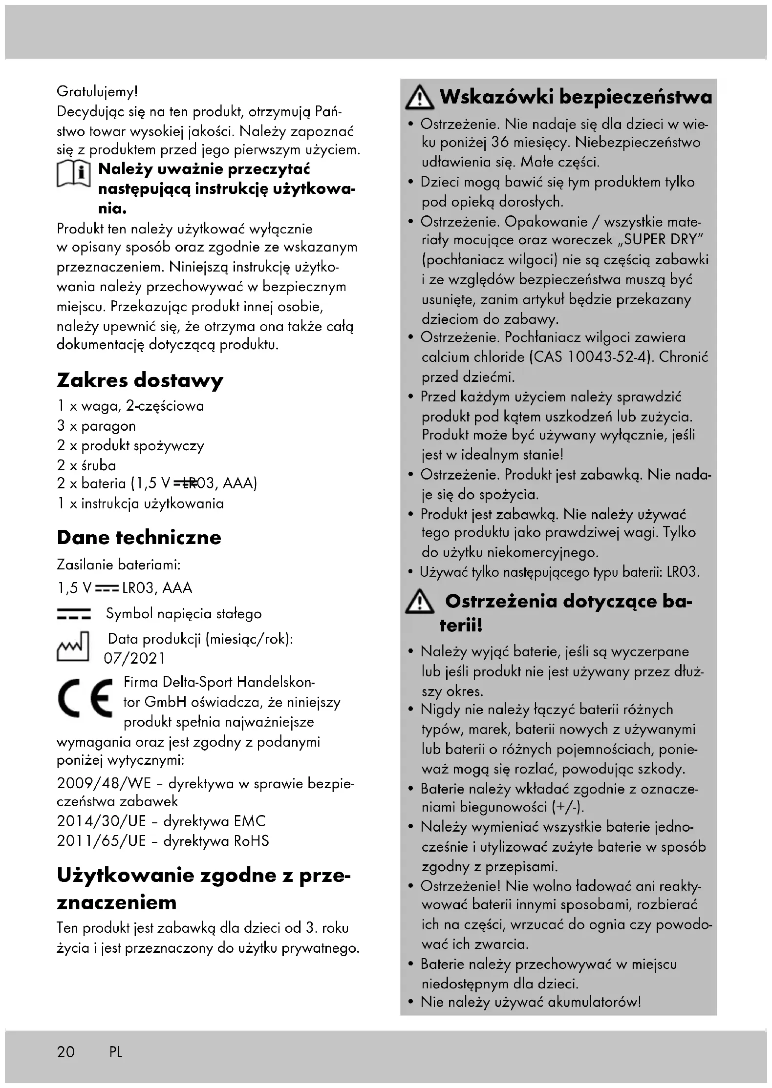 aby wyjąć paragon. Przechowywanie, czyszczenie Podczas nieużywania należy zawsze przecho- wywać produkt w suchym i czystym miejscu, z wyjętymi bateriami, w temperaturze pokojo- wej. Wycierać do czysta jedynie suchą ściereczką. WAŻNE! Nie czyścić przy użyciu ostrych środ- ków czyszczących.22 Uwagi odnośnie recyklingu Jeśli produkt jest zużyty, nie należy go wyrzucać wraz z odpadami domowymi ze względu na ochronę środowiska, ale należy go odpowiednio zutylizować. Informacje o punktach zbiórki i godzinach otwarcia można uzyskać w lokalnej administra- cji. Uszkodzone lub zużyte baterie/akumulatory należy poddać recyklingowi zgodnie z dyrek- tywą 2006/66/WE i jej zmianami. Zwrócić baterie/akumulatory i/lub produkt, korzystając z udostępnionych urządzeń przeznaczonych do zbiórki. Opakowania, takie jak torby plastikowe, nie powinny znaleźć się w rękach dzieci. Opakowanie przechowywać w miejscu niedostępnym dla dzieci. Nieprawidłowa utylizacja baterii/ akumulatorów wyrządza szkody w środowisku naturalnym! Baterii/ akumulatorów nie wolno wyrzucać razem z odpadami domowymi. Mogą zawierać toksyczne metale ciężkie i podlegają obróbce odpadów niebezpiecznych. Symbole chemiczne metali ciężkich są następujące: Cd = kadm, Hg = rtęć, Pb = ołów. Zużyte baterie/akumulato- ry należy oddawać w miejskim punkcie zbiórki. Produkt oraz opakowanie należy utylizować w sposób przyjazny dla środowiska. Przestrzegać oznakowania materiałów opakowaniowych podczas segregacji odpadów. Są one oznaczone skrótami (a) i liczbami (b) o następującym znaczeniu: 1–7: tworzywa sztuczne/20–22: papier i karton/80–98: materiały kompozytowe. Produkt i materiały opakowaniowe nadają się do recyklingu, należy je osobno zutylizować w celu lepszego przetwarzania odpadów. Logo Triman obowiązuje tylko we Francji. Informacje o sposobie utylizacji zużytego produktu są dostępne u władz lokalnych lub miejskich. Wskazówki dotyczące gwa- rancji i obsługi serwisowej Artykuł został wyprodukowany z najwyższą starannością i pod stałą kontrolą. DELTA-SPORT HANDELSKONTOR GmbH przyznaje klien- towi końcowemu na niniejszy artykuł trzy lata gwarancji od daty zakupu (okres gwarancyjny) z zastrzeżeniem poniższych postanowień. Gwa- rancja dotyczy wyłącznie wad materiałowych i wad wykonania. Gwarancja nie obejmuje części, które podlegają normalnemu zużyciu i z tego względu należy je traktować jako części zużywalne (np. baterie) i nie obejmuje części kruchych, np. przełączników, akumulatorów ani części wykonanych ze szkła. Wyklucza się roszczenia z tytułu niniejszej gwa- rancji w przypadku użycia artykułu w sposób niewłaściwy lub sprzeczny z jego przeznacze- niem lub w sposób wykraczający poza przewi- dziane przeznaczenie lub poza przewidziany zakres użytkowania lub jeśli wytyczne zawarte w instrukcji obsługi nie były przestrzegane, chyba że klient końcowy udowodni istnienie wady materiałowej lub wady wykonania, która nie wynika z podanych wyżej przyczyn. Roszczenia z tytułu gwarancji można zgłaszać wyłącznie w okresie gwarancyjnym za okaza- niem oryginalnego dowodu zakupu. Prosimy zatem zachować oryginalny dowód zakupu! W przypadku jakichkolwiek reklamacji prosimy skontaktować się z nami najpierw za pośred- nictwem podanej poniżej infolinii serwisowej lub drogą e-mailową. W przypadku objętym gwarancją artykuł zostanie – według naszego uznania – bezpłatnie naprawiony, wymieniony lub nastąpi zwrot ceny zakupu. Z gwarancji nie wynikają żadne inne prawa. Niniejsza gwarancja nie ogranicza Państwa ustawowych praw, w szczególności roszczeń gwarancyjnych wobec danego sprzedawcy. W przypadku wymiany części lub całego arty- kułu okres gwarancji przedłuża się o trzy lata zgodnie z art. 581 § 1 kodeksu cywilnego. Po upłynięciu czasu gwarancji powstałe naprawy są płatne. PL23PL IAN: 366888_2101 Serwis Polska Tel.: 22 397 4996 E-Mail: deltasport@lidl.pl24 Srdečně blahopřejeme! Svým nákupem jste se rozhodli pro kvalitní výro- bek. Před prvním použitím se prosím seznamte s tímto výrobkem. Pozorně si přečtete následující návod k použití. Používejte tento výrobek pouze tak, jak je popsáno, a pro uvedené účely. Uschovejte si tento návod k použití pro budoucí použití. Pokud výrobek předáte třetí osobě, předejte jí i veške- rou dokumentaci. Obsah balení 1 x váha, 2dílná 3 x pokladní doklad 2 x potravina 2 x šroub 2 x baterie (1,5 V LR03, AAA) 1 x návod k použití Technické údaje Zdroj energie (baterie): 1,5 V LR03, AAA Symbol pro stejnosměrné napětí Datum výroby (měsíc/rok): 07/2021 Společnost Delta-Sport Handelskon- tor GmbH tímto prohlašuje, že tento výrobek je v souladu s následujícími základními požadavky a ostatními příslušnými ustanoveními: 2009/48/ES – Směrnice o bezpečnosti hraček 2014/30/EU – Směrnice o EMK 2011/65/EU – Směrnice RoHS Použití dle určení Tento výrobek je hračka pro děti od 3 let, je určen jen pro soukromé použití. Bezpečnostní pokyny