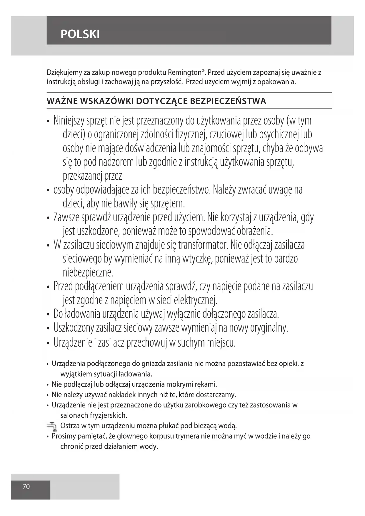 - Prosimi pamietac, ze glownikego korpusu trymera nie maya myc w wodzie i nalezy go chronić przyd dzialaniem wody.