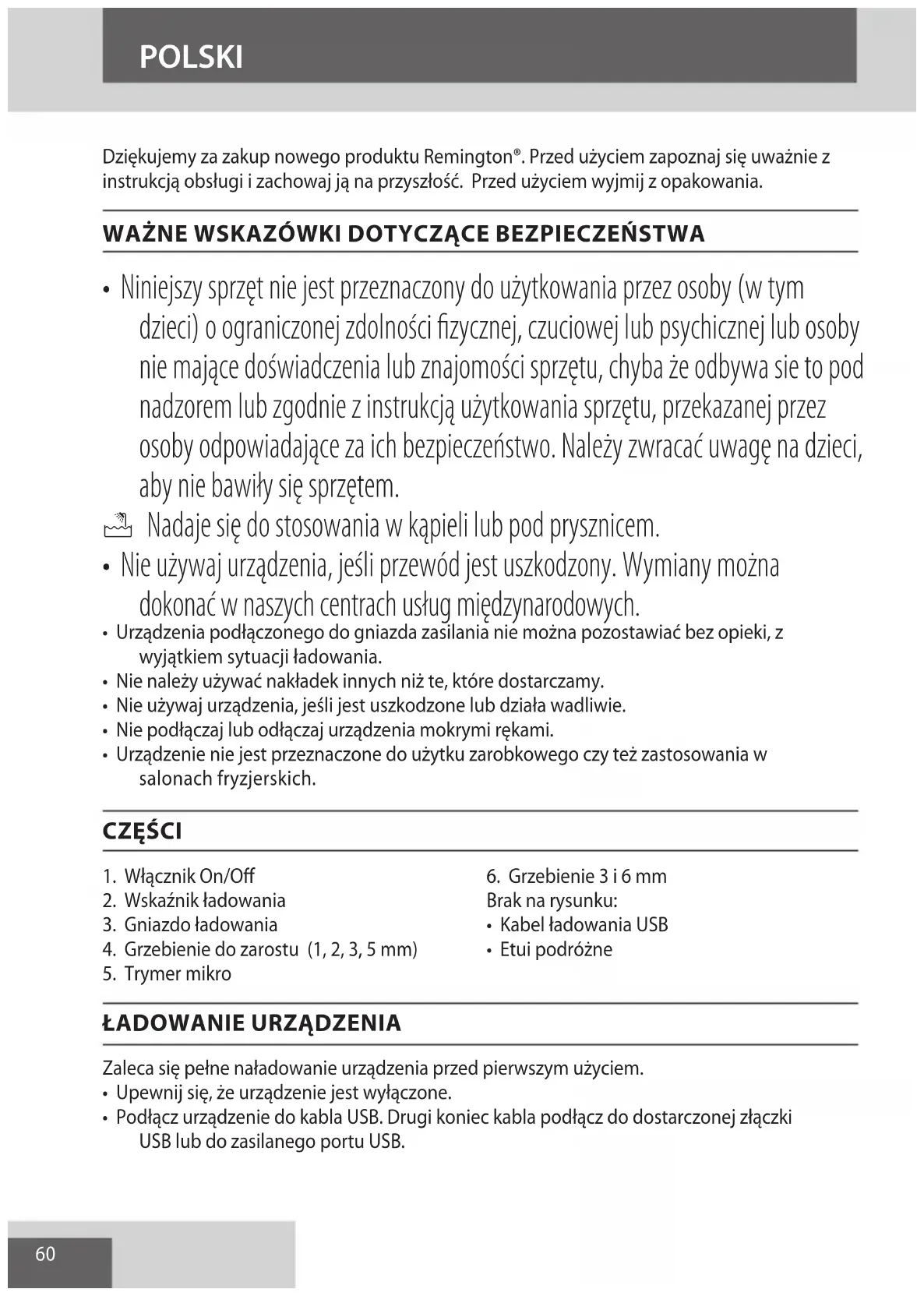 AE60 Dziękujemy za zakup nowego produktu Remington®. Przed użyciem zapoznaj się uważnie z instrukcją obsługi i zachowaj ją na przyszłość. Przed użyciem wyjmij z opakowania. WAŻNE WSKAZÓWKI DOTYCZĄCE BEZPIECZEŃSTWA