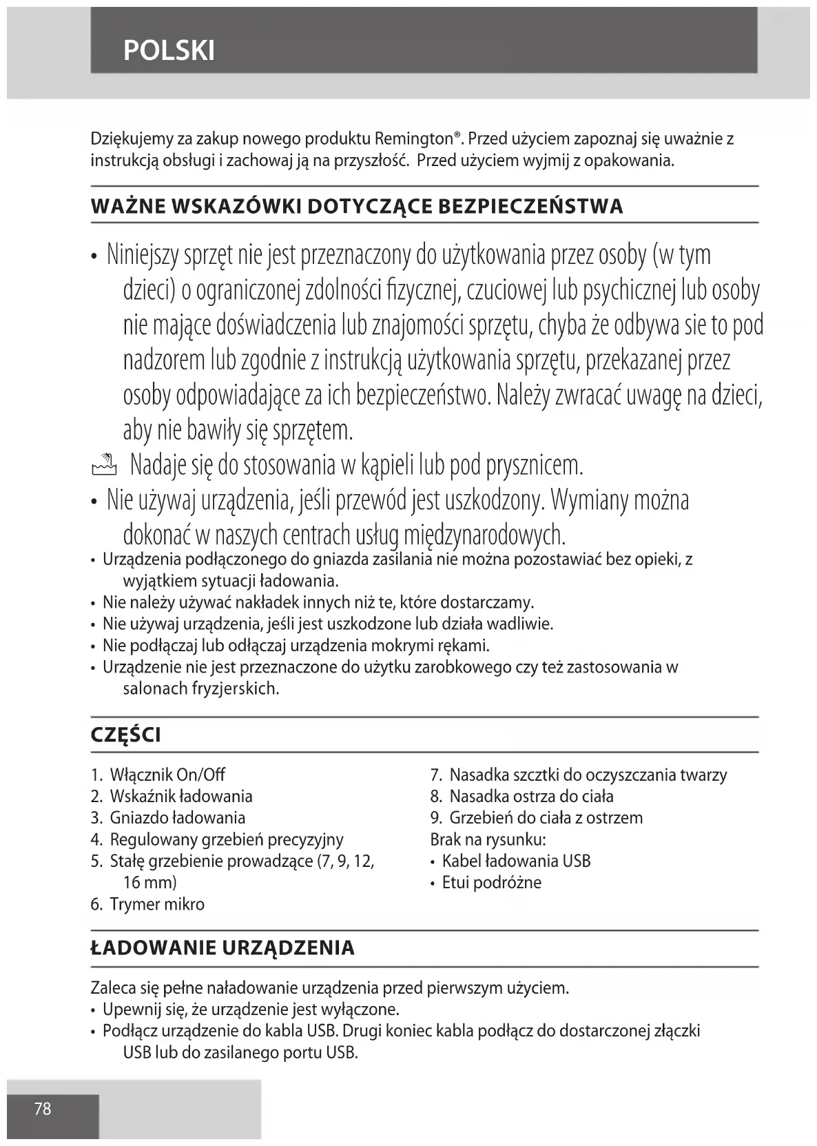 AE78 Dziękujemy za zakup nowego produktu Remington®. Przed użyciem zapoznaj się uważnie z instrukcją obsługi i zachowaj ją na przyszłość. Przed użyciem wyjmij z opakowania. WAŻNE WSKAZÓWKI DOTYCZĄCE BEZPIECZEŃSTWA