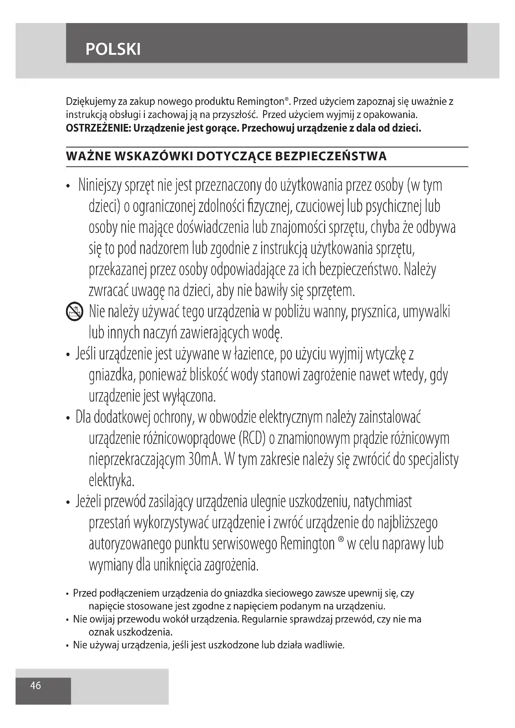 - Jeżeli przewód zasilający urządzenia ulegnie uszkodzeniu, natychmiast przestań wykorzystywać urządzenie i zwróć urządzenie do najbliższego autoryzowanego punktu serwisowego Remington ® w celu naprawy lub wymiany dla uniknięcia zagrożenia.