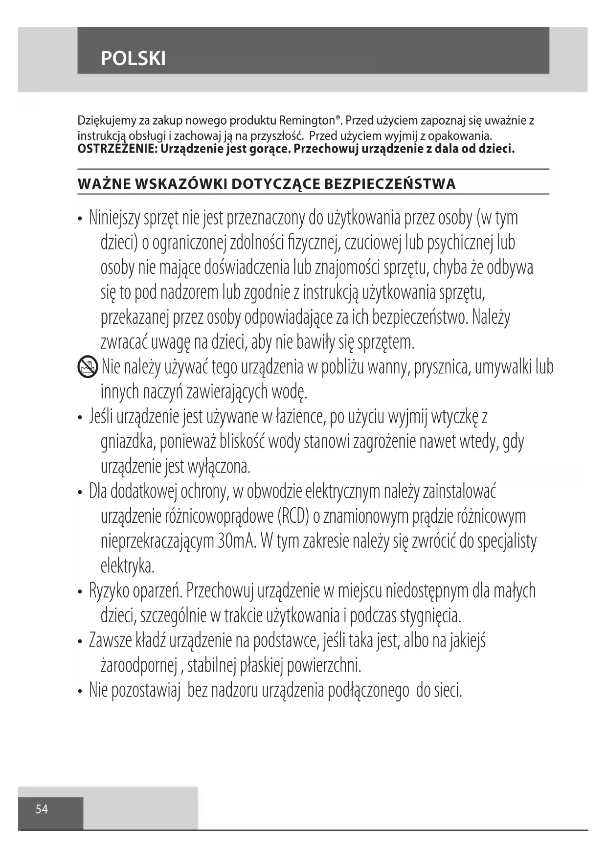 AE54 Dziękujemy za zakup nowego produktu Remington®. Przed użyciem zapoznaj się uważnie z instrukcją obsługi i zachowaj ją na przyszłość. Przed użyciem wyjmij z opakowania. OSTRZEŻENIE: Urządzenie jest gorące. Przechowuj urządzenie z dala od dzieci. WAŻNE WSKAZÓWKI DOTYCZĄCE BEZPIECZEŃSTWA