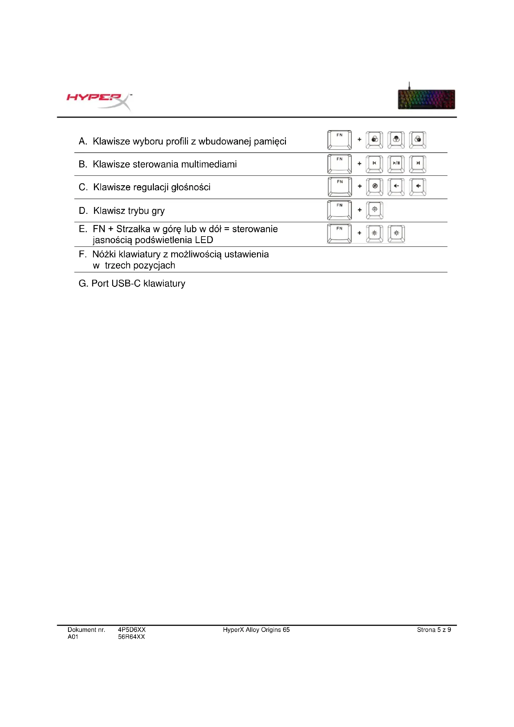Masz pytania lub problemy z konfiguracją? Skontaktuj się z działem pomocy technicznej HyperX na stronie: hyperxgaming.com/support/окумент № 4P5D6XX HyperX Alloy Origins 65 Страница 1 из 9 A01 56R64XX