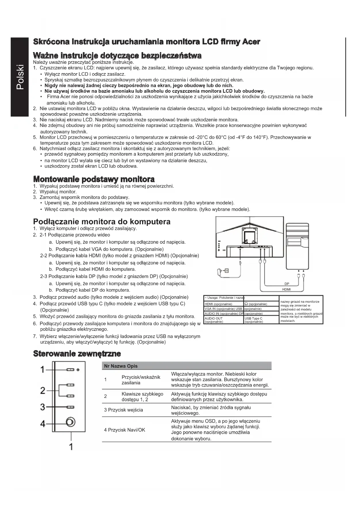(typowy) Kontrast Maks. 100000000:1 (ACM) Kąt widzenia 178° (w poziomie) 178° (w pionie) (CR=10) Czas reakcji 1 ms (VRB) Typ panela VA Częstotliwość pozioma HDMI: 31,469-192,692 KHz DP: 31,469-192,692 KHz Częstotliwość pionowa HDMI: 48-165 Hz DP: 48-165 Hz Wyświetlane kolory 16,7 mln kolorów Zegar plamki HDMI: 393,092 MHz DP: 393,092 MHz Maksymalna rozdzielczość HDMI: 1920×1080 przy częstotliwości 165 Hz DP: 1920×1080 przy częstotliwości 165 Hz Plug & Play VESA DDCCI/DDC2B Pobór mocy Tryb włączenia 21 W (typowy) Tryb uśpienia 0,5 W (typowy) Tryb wyłączenia 0,3 W (typowy) Złącze wejściowe HDMI (tylko modele z wejściem HDMI) (opcjonalnie) DP (tylko model z wejściem DP) (opcjonalnie) Sygnał wejścia video HDMI (tylko modele z wejściem HDMI) (opcjonalnie) DP (tylko model z wejściem DP) (opcjonalnie) Głośniki 2W x 2 (tylko modele z wejściem audio) (opcjonalnie) Maksymalny rozmiar ekranu W poziomie: 527 mm W pionie: 296 mm Źródło zasilania WEJŚCIE: 100-240 V ~ 50/60 Hz Warunki otoczenia Temp. działania: 0° do 40°C Temp. przechowywania: -20° do 60°C Wilgotność podczas pracy: 20% do 80% Wymiary 540,3 (szer.) × 375,0-495,0 (wys.) × 234,0 (głęb.) mm Masa (netto) 4,30 Kg (netto) Dane techniczne mechanizmu Nachylanie: -5° do +25° Obracanie: +/-360° Regulacja wysokości: 120mm Przekręcanie: +/-90° Odłączane nóżki podstawy: Tak Zewnętrzne elementy sterowania Przełącznik/przyciski Przycisk Zasilanie Klawisz szybkiego dostępu 1 Klawisz szybkiego dostępu 2 Wejście Menu/Navi/OK Funkcje Jasność Kontrast Niska Emisja Niebieskiego Światła Wzmocn. czerni ACM HDR Super ostrość Gamma Temp. koloru Tryby Przestrz. kolor. Tryb odc. szar. 6-osiowa barwa Nasyc. 6-osiow Głośność Wyciszenie Over Drive FreeSync Premium VRB Częst. odśwież. Bardzo małe opóźnienie Cel Język Wyłączenie OSD Przezroczystość Blokada OSD Wejście Auto źródło Tryb szeroki Przypis. przyc. skrótu DDC/CI Poz. czarn. HDMI Tryb szyb. uruch Informacje Resetuj wszyst. ustaw. Dane techniczne zależą od modelu i/lub regionu. Podręczniki i inne dokumenty dla produktu Acer, można znaleźć na oficjalnej stronie internetowej pomocy technicznej Acer.Português Manual de início rápido (QSG) do monitor LCD da Acer Instruções de segurança importantes Leia atentamente as instruções que se seguem. 1. Limpar o ecrã do monitor LCD: primeiro, verificar se o adaptador de corrente que está a usar corresponde às normas elétricas da sua região.