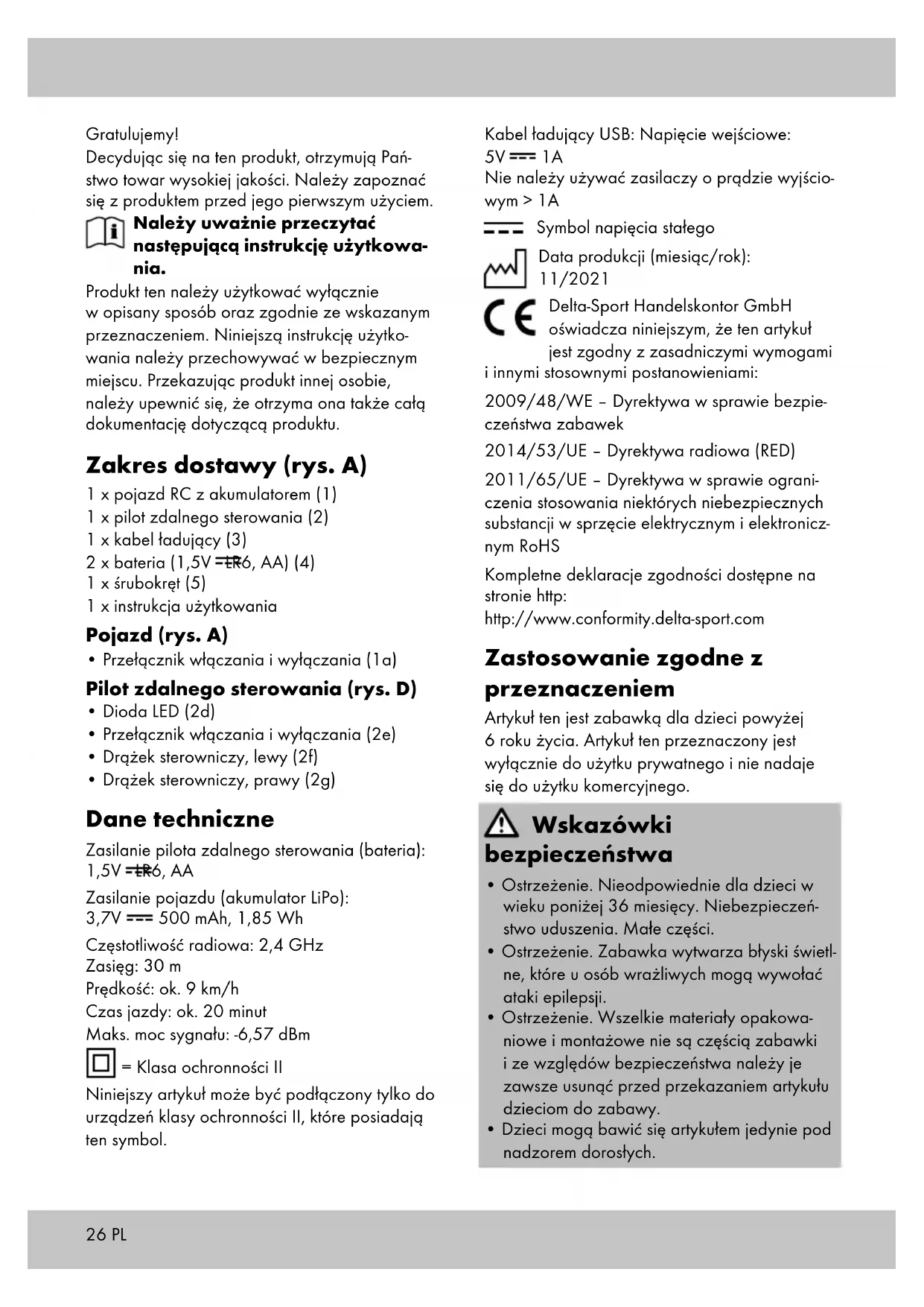 Nie należy używać zasilaczy o prądzie wyjścio- wym > 1A Symbol napięcia stałego Data produkcji (miesiąc/rok): 11/2021 Delta-Sport Handelskontor GmbH oświadcza niniejszym, że ten artykuł jest zgodny z zasadniczymi wymogami i innymi stosownymi postanowieniami: 2009/48/WE – Dyrektywa w sprawie bezpie- czeństwa zabawek 2014/53/UE – Dyrektywa radiowa (RED) 2011/65/UE – Dyrektywa w sprawie ograni- czenia stosowania niektórych niebezpiecznych substancji w sprzęcie elektrycznym i elektronicz- nym RoHS Kompletne deklaracje zgodności dostępne na stronie http: http://www.conformity.delta-sport.com Zastosowanie zgodne z przeznaczeniem Artykuł ten jest zabawką dla dzieci powyżej 6 roku życia. Artykuł ten przeznaczony jest wyłącznie do użytku prywatnego i nie nadaje się do użytku komercyjnego. Wskazówki bezpieczeństwa
