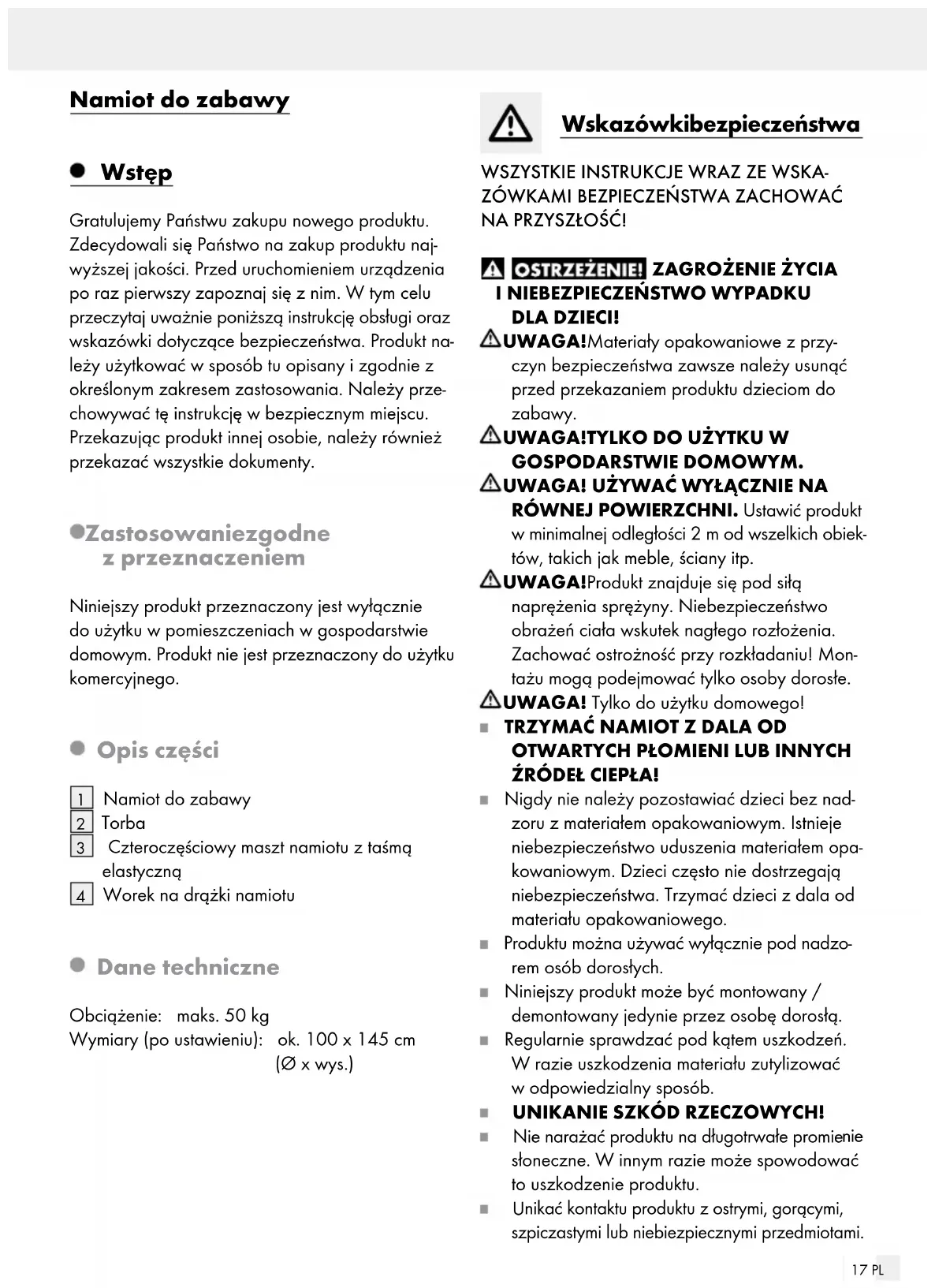 Demontaż i przechowywanie Usunąć drążki namiotu z produktu. Złożyć produkt i włożyć ogo do torby (rys. D). Czyszczenie Produkt należy czyścić tylko na stronie zewnętrz- nej miękką, wilgotną szmatką. Utylizacja Opakowanie wykonane jest z materiałów przyja- znych dla środowiska, które można przekazać do utylizacji w lokalnym punkcie przetwarzania surow- ców wtórnych. Informacji na temat możliwości utylizacji wyeksplo- atowanego produktu udziela urząd gminy lub miasta. Gwarancja Produkt wyprodukowano według wysokich standar- dów jakości i poddano skrupulatnej kontroli przed wysyłką. W przypadku wad produktu nabywcy przy- sługują ustawowe prawa. Gwarancja nie ogranicza ustawowych praw nabywcy produktu. Produkt objęte jest 3 gwarancją, licząc od daty zakupu. Gwarancja wygasa w razie zawinionego przez użytkownika uszkodzenia produktu, niewła- ściwego użycia lub konserwacji. W przypadku wystąpienia w ciągu 3 lat od daty zakupu wad materiałowych lub fabrycznych, doko- nujemy – według własnej oceny – bezpłatnej naprawy lub wymiany produktu. Świadczenie gwarancyjne obejmuje wady materia- łowe i fabryczne. Gwarancja nie obejmuje części pro- duktu ulegających normalnemu zużyciu, uznawan ych za części zużywalne (np. baterie) oraz uszkodzeń części łamliwych, np. przełączników, akumulatorów lub wykonanych ze szkła. Zgodnie z Kodeksem Cywilnym art. 581 §1 wraz z wymianą urządzenia lub ważnej części czas gwarancji rozpoczyna się na nowo. Sposób postępowania w przy- padku naprawy gwarancyjnej Aby zapewnić szybkie rozpatrzenie Państwa wnios ku, prosimy stosować się do następujących wskazówek: Przed skontaktowaniem się z działem serwisowym należy przygotować paragon i numer artykułu (np. IAN 123456_7890) jako dowód zakupu. Numery artykułów można znaleźć na tabliczce znamionowe, na grawerunku, na stronie tytułowej jego instrukcji (na dole po lewej stronie) lub jako naklejkę na stronie odwrotnej lub spodniej. W razie wystąpienia błędów w działaniu lub innych wad, należy skontaktować się najpierw z wymie- nionym poniżej działem serwisowym telefonicznie lub pocztą elektroniczną.19 PL Produkt uznany za uszkodzony można następnie z dołączeniem dowodu zakupu (paragonu) i podani em, na czym polega wada i kiedy wystąpiła, przesłać bezpłatnie na podany Państwu adres serwisu. Serwis Serwis Polska Tel.: 008004911946 E-Mail: owim@lidl.pl20 CZ Dětský stan na hraní Úvod Blahopřejeme Vám ke koupi nového výrobku. Roz- hodli jste se pro kvalitní výrobek. Před prvním uve- dením do provozu se seznamte s výrobkem. K tomu si pozorně přečtěte následující návod k obsluze a bezpečnostní pokyny. Používejte výrobek jen popsa- ným způsobem a pouze pro uvedené oblasti použití. Uschovejte si tento návod na bezpečném místě. Všechny podklady vydejte při předání výrobku i třetí osobě. Použití ke stanovenému účelu Tento výrobek je určený pro privátní použití v místnostech domácností. Výrobek není určen ke komerčnímu využívání. Popis dílů