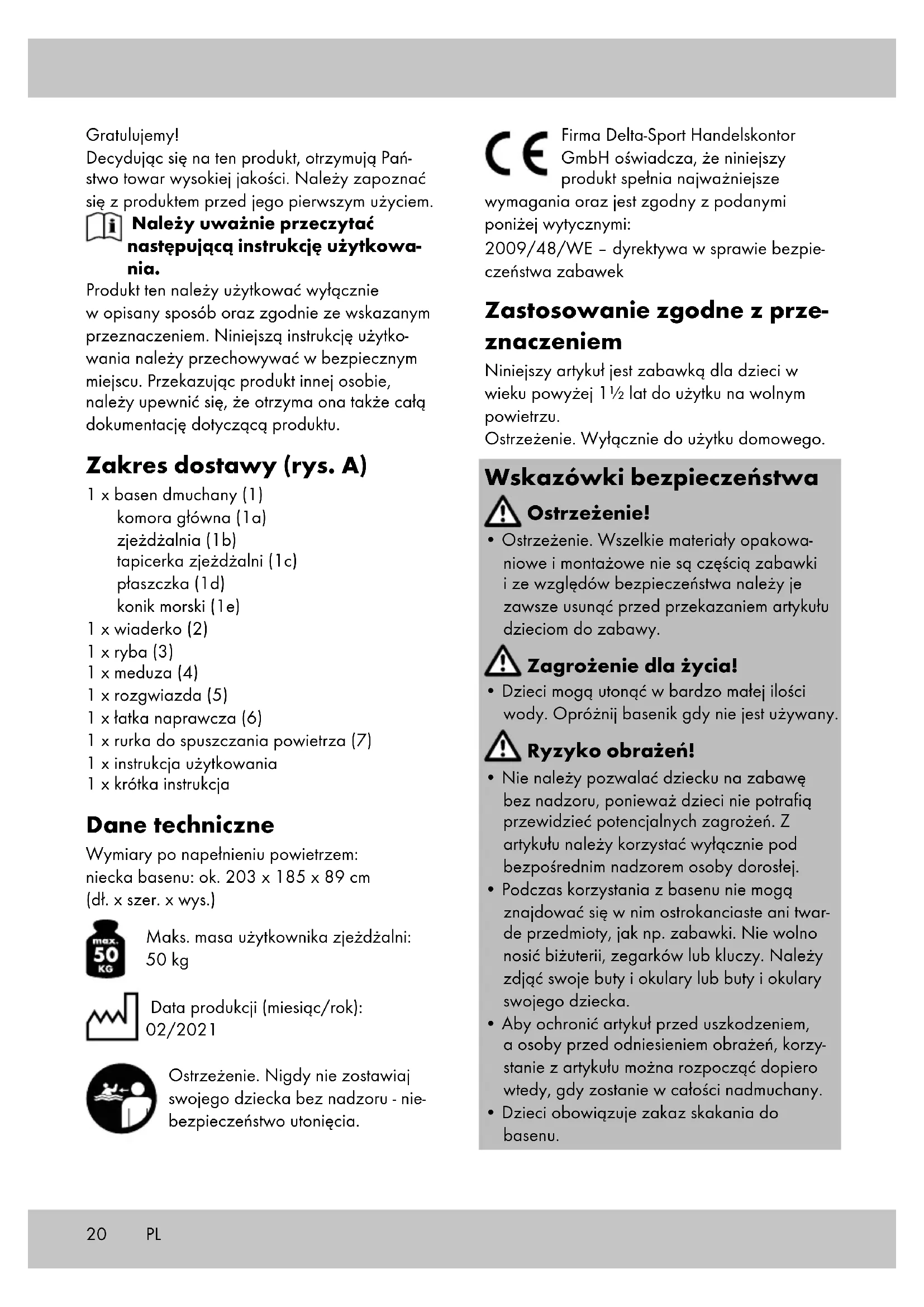łożyć ją do uszkodzonego miejsca i mocno docisnąć. Przechowywanie, czyszcze- nie Należy często wymieniać wodę w artykule, zwłaszcza w upalne dni i gdy jest brudna! Podczas nieużywania należy zawsze przecho- wywać nienapompowany artykuł w suchym i czystym miejscu w temperaturze pokojowej. W trakcie przechowywania zawory muszą być przez cały czas zamknięte. Artykuł czyścić tylko wodą lub wodą z mydłem, nigdy przy użyciu ostrych środków czyszczących. Podczas przechowywania przez zimę nie umieszczać na artykule żadnych ostrych przedmiotów i nie posypywać talkiem. Uwagi odnośnie recyklingu Artykuł oraz materiały opakowaniowe nale- ży usunąć zgodnie z aktualnymi przepisami obowiązującymi w danym miejscu. Materiały opakowaniowe, jak np. worki foliowe nie powinny znaleźć się w rękach dzieci. Materiał opakowaniowy należy przechowywać w miej- scu niedostępnym dla dzieci. Zutylizować produkt i opakowanie w sposób przyjazny dla środowiska. Kod materiału do recyklingu służy do oznaczenia różnych materiałów przeznaczonych do zwrotu do przetwór- stwa wtórnego (recyklingu). Kod składa się z symbolu, który powinien odzwierciedlać cykl odzysku, oraz numeru oznaczającego materiał. Wskazówki dotyczące gwa- rancji i obsługi serwisowej Produkt został wyprodukowany bardzo staran- nie i podczas stałej kontroli. Państwo otrzymują na ten produkt trzy lata gwarancji od daty zakupu. Prosimy o zachowanie paragonu. Gwarancja obejmuje tylko błędy materiałowe lub fabryczne i traci ważność podczas używa- nia produktu nie właściwie i nie zgodnie z jego przeznaczeniem. Państwa prawa, w szczególno- ści zasady odpowiedzialności z tytułu rękojmi, nie zostaną ograniczone tą gwarancję. W razie ewentualnych reklamacji należy skontaktować się pod niżej podanym numerem infolinii lub po- przez pocztę elektroniczną. Nasi współpracow- nicy omówią z Państwem jak najszybciej dalszy przebieg sprawy. Z naszej strony gwarantujemy doradztwo. W przypadku wymiany części lub całego arty- kułu okres gwarancji przedłuża się o trzy lata zgodnie z art. 581 § 1 kodeksu cywilnego. Po upłynięciu czasu gwarancji powstałe naprawy są płatne. IAN: 351982_2007 Serwis Polska Tel.: 22 397 4996 E-Mail: deltasport@lidl.pl PL24 CZ Srdečně blahopřejeme! Svým nákupem jste se rozhodli pro kvalitní výro- bek. Před prvním použitím se prosím seznamte s tímto výrobkem. Pozorně si přečtete následující návod k použití. Používejte tento výrobek pouze tak, jak je popsáno, a pro uvedené účely. Uschovejte si tento návod k použití pro budoucí použití. Pokud výrobek předáte třetí osobě, předejte jí i veške- rou dokumentaci. Rozsah dodávky (obr. A) 1 x zážitkový bazének (1) hlavní komora (1a) skluzavka (1b) polštář skluzavky (1c) rejnok (1d) mořský koník (1e) 1 x vědro (2) 1 x rybka (3) 1 x medúza (4) 1 x mořská hvězdice (5) 1 x záplata na opravu (6) 1 x vypouštěcí trubička (7) 1 x návod k použití 1 x krátký návod Technická data Rozměry (nafouknuto): Koupací nádrž: cca 203 x 185 x 89 cm (d x š x v) Max. váha uživatele na skluzavce: 50 kg Datum výroby (měsíc/rok): 02/2021 Upozornění. Nikdy nenechávejte dítě bez dozoru – nebezpečí utonutí. Společnost Delta-Sport Handelskontor GmbH tímto prohlašuje, že tento výrobek je v souladu s následujícími základními požadavky a ostatními příslušnými ustanoveními: 2009/48/ES – Směrnice o bezpečnosti hraček Použití ke stanovenému účelu Tento výrobek je hračka pro děti od 1½ let pro venkovní použití. Upozornění. Jen pro domácí použití. Bezpečnostní pokyny Upozornění!