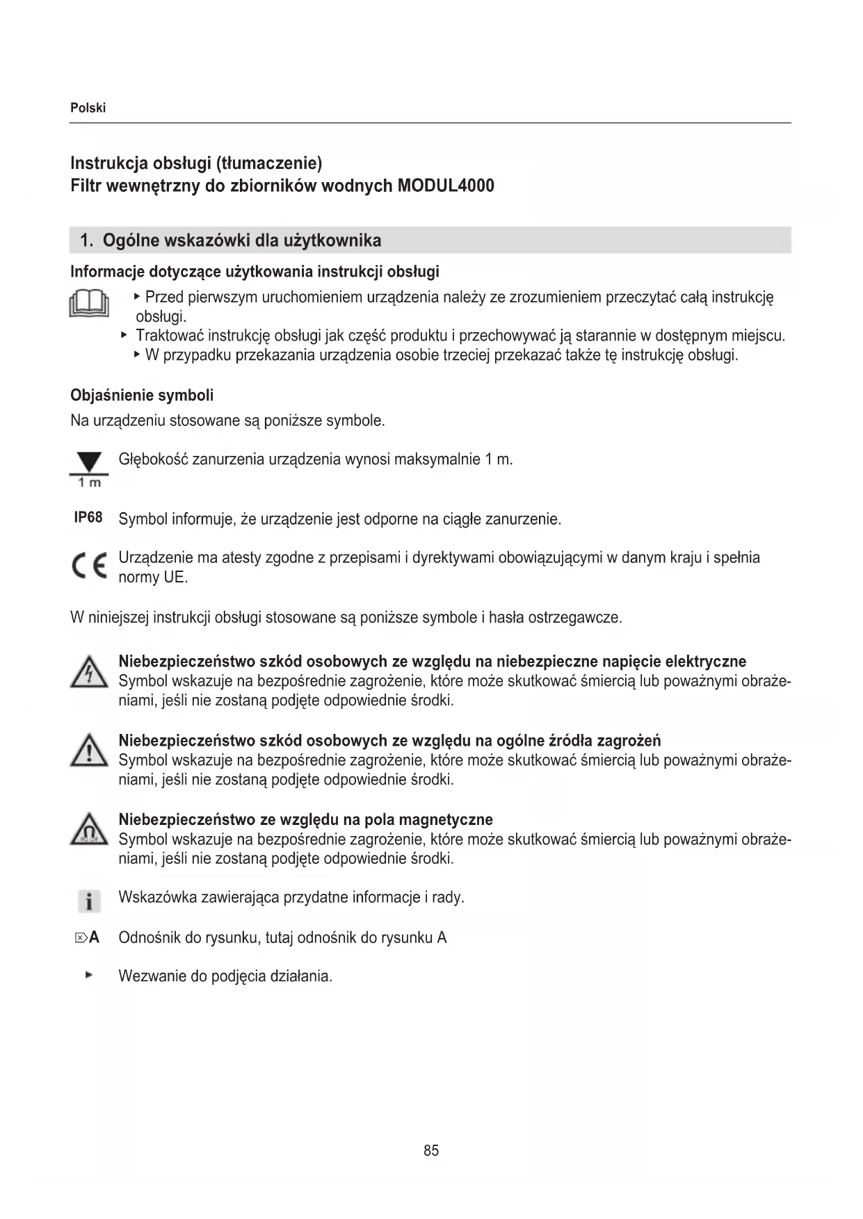 Informacje dotyczące użytkowania instrukcji obsługi ▶ Przed pierwszym uruchomieniem urządzenia należy ze zrozumieniem przeczytać całą instrukcję obsługi. ▶ Traktować instrukcję obsługi jak część produktu i przechowywać ją starannie w dostępnym miejscu. ▶ W przypadku przekazania urządzenia osobie trzeciej przekazać także tę instrukcję obsługi. Objaśnienie symboli Na urządzeniu stosowane są poniższe symbole. Głębokość zanurzenia urządzenia wynosi maksymalnie 1 m. Symbol informuje, że urządzenie jest odporne na ciągłe zanurzenie. Urządzenie ma atesty zgodne z przepisami i dyrektywami obowiązującymi w danym kraju i spełnia normy UE. W niniejszej instrukcji obsługi stosowane są poniższe symbole i hasła ostrzegawcze. Niebezpieczeństwo szkód osobowych ze względu na niebezpieczne napięcie elektryczne Symbol wskazuje na bezpośrednie zagrożenie, które może skutkować śmiercią lub poważnymi obraże