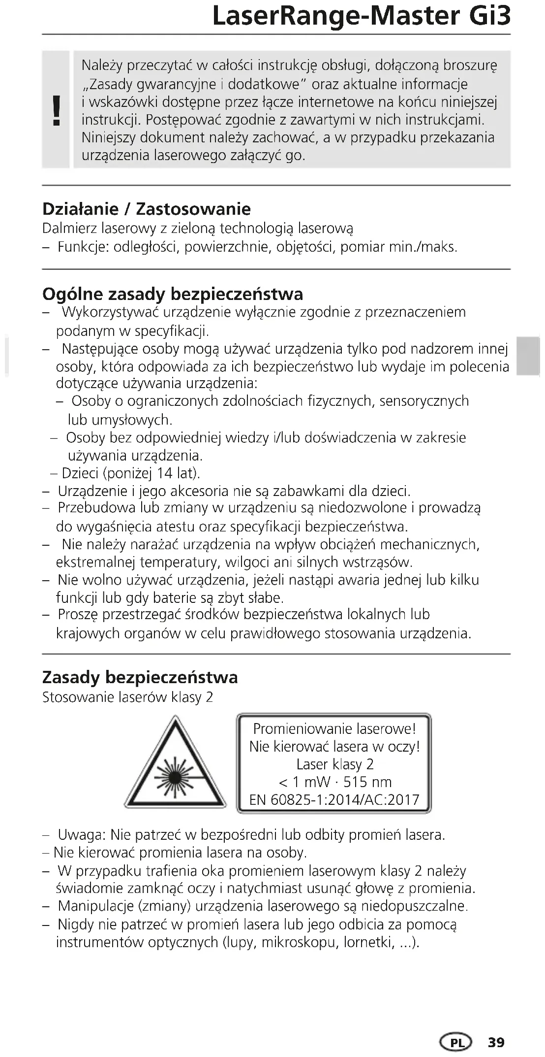 Działanie / Zastosowanie Należy przeczytać wcałości instrukcję obsługi, dołączoną broszurę „Zasady gwarancyjne idodatkowe” oraz aktualne informacje iwskazówki dostępne przez łącze internetowe na końcu niniejszej instrukcji. Postępować zgodnie z zawartymi w nich instrukcjami. Niniejszy dokument należy zachować, a w przypadku przekazania urządzenia laserowego załączyć go.