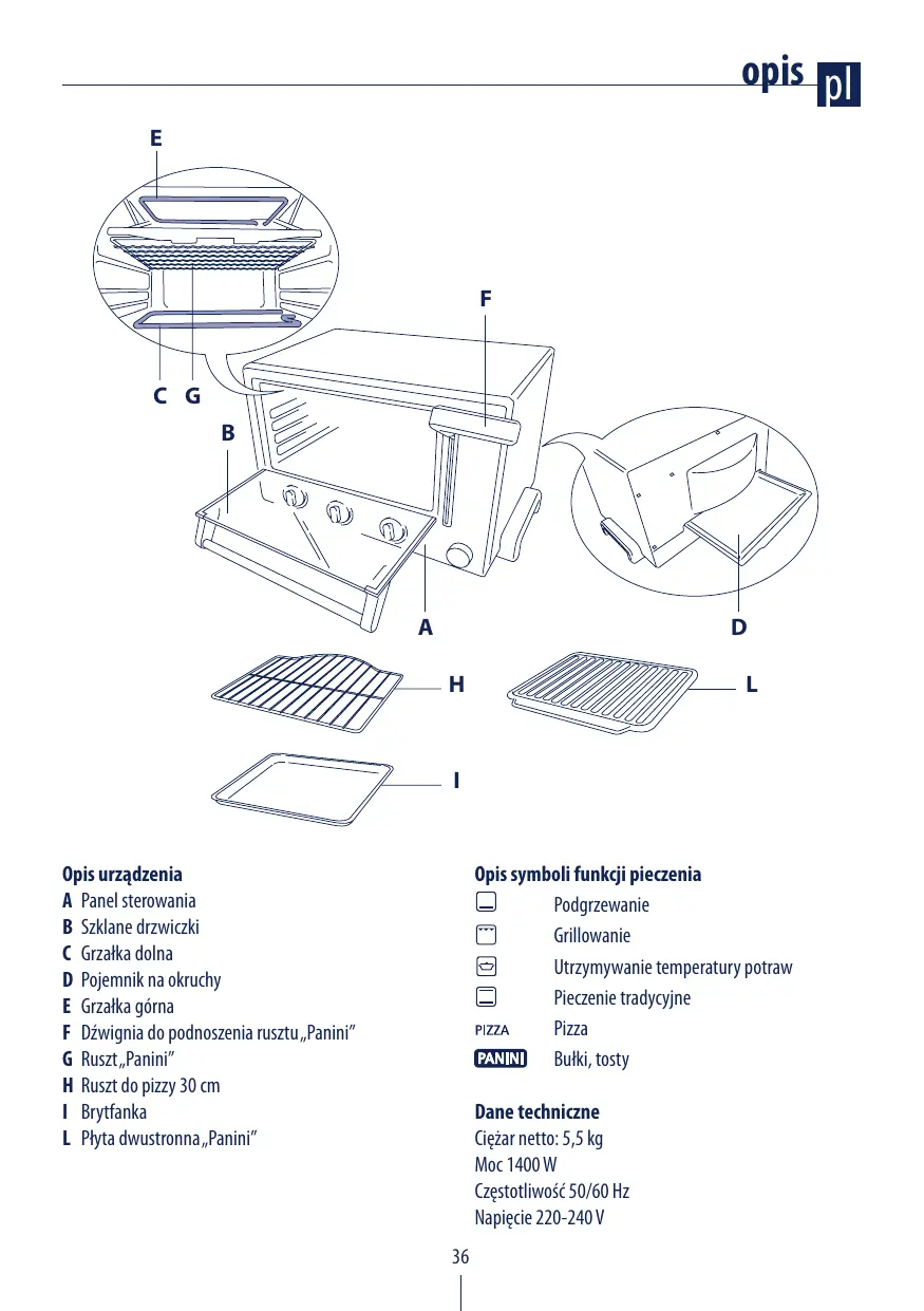 Opis urządzenia A Panel sterowania B Szklane drzwiczki C Grzałka dolna D Pojemnik na okruchy E Grzałka górna F Dźwignia do podnoszenia rusztu „Panini” G Ruszt „Panini” H Ruszt do pizzy 30 cm I Brytfanka L Płyta dwustronna „Panini” Opis symboli funkcji pieczenia Podgrzewanie Grillowanie Utrzymywanie temperatury potraw Pieczenie tradycyjne Pizza Bułki, tosty Dane techniczne Ciężar netto: 5,5 kg Moc 1400 W Częstotliwość 50/60 Hz Napięcie 220-240 V