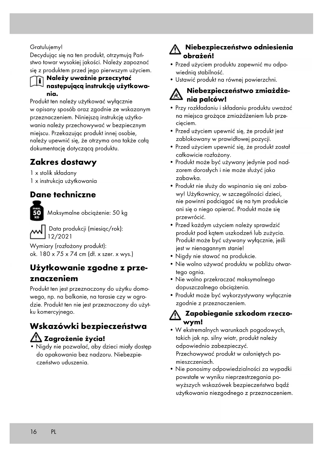 - Przy rozkładaniu i składaniu produktu uważać na miejsca grożące zmiażdżeniem lub prze- cięciem.