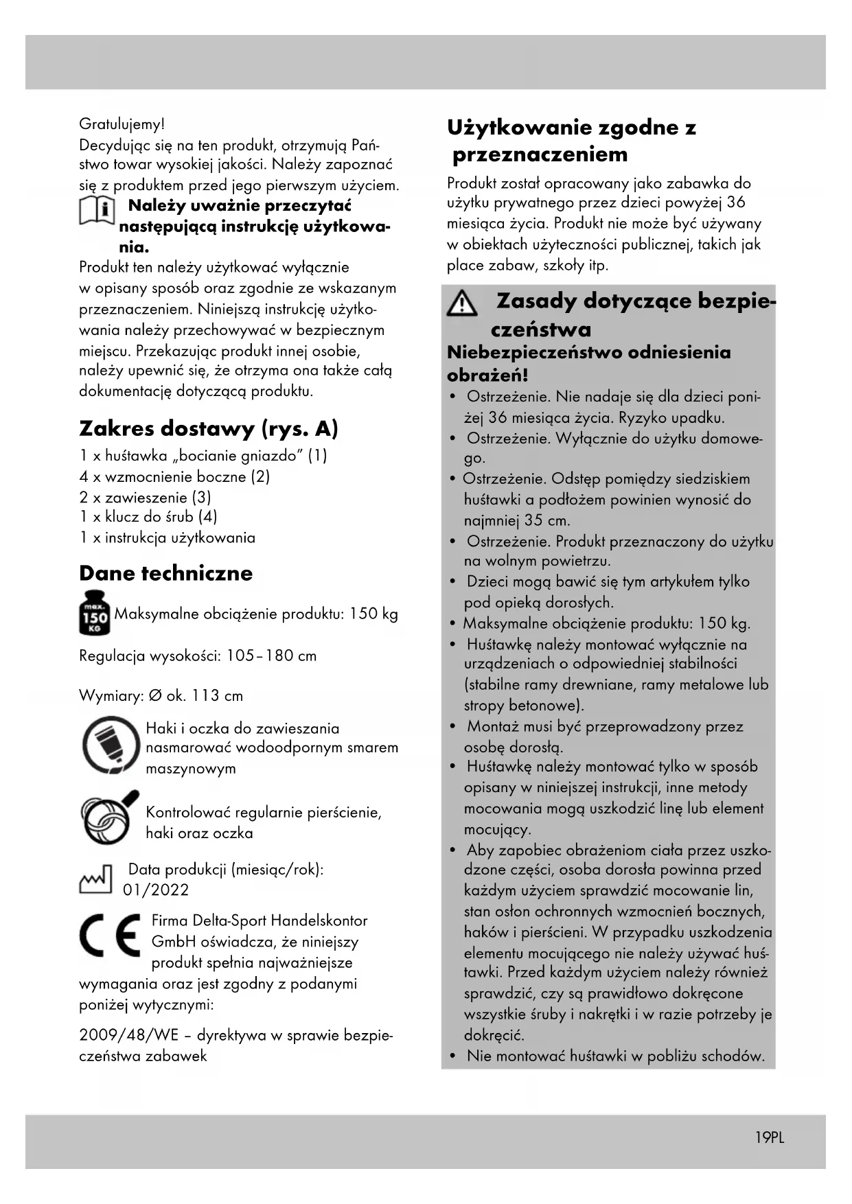 Huśtawkę należy mocować tylko na takich urządzeniach i w takich miejscach, w których z absolutną pewnością można zagwarantować wystarczającą wytrzymałość. Aby zapobiec przypadkowemu poluzowaniu, do montażu należy zastosować powszechnie dostępne haki huśtawkowe o grubości co najmniej 10 mm, wyposażone w funkcję bezpieczeństwa. Aby uzyskać wystarczająco bezpieczne połączenie belek drewnianych, mocowanie należy całkowi- cie wsunąć przez drewno i zablokować od góry. Różne haki mocujące Element huśtawki należy mocować wyłącznie do odpowiednich uchwytów. Odpowiednie uchwyty to: Nr 1: zamknięte ucha mocujące, mocowane do elementów huśtawki za pomocą karabińczyków (rys. D). Nr 2: powszechnie dostępny hak huśtawkowy z funkcją bezpieczeństwa zapobiegającą przy- padkowemu poluzowaniu (rys. E). Wskazówka! Oczko mocowania (1) musi przebiegać poprzecznie w stosun- ku do kierunku ustawienia huśtawki, co ma na celu uniemożliwienie nadmier- nego uszkodzenia elementu mocujące- go podczas użytkowania huśtawki.21 Regulacja wysokości huśtawki Wysokość siedziska można regulować za po- mocą pierścieni umieszczonych w górnej części huśtawki. Po dostosowaniu długości liny dociągana jest ona pod obciążeniem (rys. F). Ustawić długość obu lin w taki sposób, aby huśtawka znajdowa- ła się w pozycji absolutnie poziomej. Konserwacja (rys. G) Należy regularnie sprawdzać, czy pierścienie, haki oraz oczka artykułu są w nienagannym stanie, oraz należy smarować dostępnym w handlu wodoodpornym smarem maszynowym pierścienie do zawieszania dołączone do artykułu jak i również zakupione osobno przez Państwa haki do zawieszania. Alternatywnie można użyć smaru do łańcuchów. Przechowywanie, czyszcze- nie Podczas nieużywania należy zawsze przecho- wywać produkt w suchym i czystym miejscu, w temperaturze pokojowej. Czyścić wyłącznie wodą, a następnie wytrzeć do sucha ściereczką. WAŻNE! Nie czyścić przy użyciu ostrych środków czyszczących. Uwagi odnośnie recyklingu Artykuł oraz materiały opakowaniowe nale- ży usunąć zgodnie z aktualnymi przepisami obowiązującymi w danym miejscu. Materiały opakowaniowe, jak np. worki foliowe nie powinny znaleźć się w rękach dzieci. Materiał opakowaniowy należy przechowywać w miej- scu niedostępnym dla dzieci. Zutylizować produkt i opakowanie w sposób przyjazny dla środowiska. Kod materiału do recyklingu służy do oznaczenia różnych materiałów przeznaczonych do zwrotu do przetwór- stwa wtórnego (recyklingu). Kod składa się z symbolu, który powinien odzwierciedlać cykl odzysku, oraz numeru oznaczającego materiał. Wskazówki dotyczące gwa- rancji i obsługi serwisowej Artykuł został wyprodukowany z najwyższą starannością i pod stałą kontrolą. DELTA-SPORT HANDELSKONTOR GmbH przyznaje klien- towi końcowemu na niniejszy artykuł trzy lata gwarancji od daty zakupu (okres gwarancyjny) z zastrzeżeniem poniższych postanowień. Gwa- rancja dotyczy wyłącznie wad materiałowych i wad wykonania. Gwarancja nie obejmuje części, które podlegają normalnemu zużyciu i z tego względu należy je traktować jako części zużywalne (np. baterie) i nie obejmuje części kruchych, np. przełączników, akumulatorów ani części wykonanych ze szkła. Wyklucza się roszczenia z tytułu niniejszej gwarancji w przypadku użycia artykułu w sposób niewłaściwy lub sprzeczny z jego przeznacze- niem lub w sposób wykraczający poza przewi- dziane przeznaczenie lub poza przewidziany zakres użytkowania lub jeśli wytyczne zawarte w instrukcji obsługi nie były przestrzegane, chyba że klient końcowy udowodni istnienie wady ma- teriałowej lub wady wykonania, która nie wynika z podanych wyżej przyczyn. Roszczenia z tytułu gwarancji można zgłaszać wyłącznie w okresie gwarancyjnym za okazaniem oryginalnego dowodu zakupu. Prosimy zatem zachować ory- ginalny dowód zakupu! W przypadku jakichkol- wiek reklamacji prosimy skontaktować się z nami najpierw za pośrednictwem podanej poniżej infolinii serwisowej lub drogą e-mailową. W przypadku objętym gwarancją artykuł zostanie – według naszego uznania – bezpłatnie naprawio- ny, wymieniony lub nastąpi zwrot ceny zakupu. Z gwarancji nie wynikają żadne inne prawa. Niniejsza gwarancja nie ogranicza Państwa ustawowych praw, w szczególności roszczeń gwarancyjnych wobec danego sprzedawcy. W przypadku wymiany części lub całego artykułu okres gwarancji przedłuża się o trzy lata zgodnie z art. 581 § 1 kodeksu cywilnego. Po upłynięciu czasu gwarancji powstałe naprawy są płatne. IAN: 384896_2107 Serwis Polska Tel.: 22 397 4996 E-Mail: deltasport@lidl.pl PL22 Použití v souladu s určeným účelem Výrobek je koncipován jako hračka pro soukro- mé použití pro děti starší 36 měsíců. Výrobek nesmí být používán ve veřejných zařízeních, jako na dětských hřištích, ve školách apod. Bezpečnostní pokyny Nebezpečí poranění!