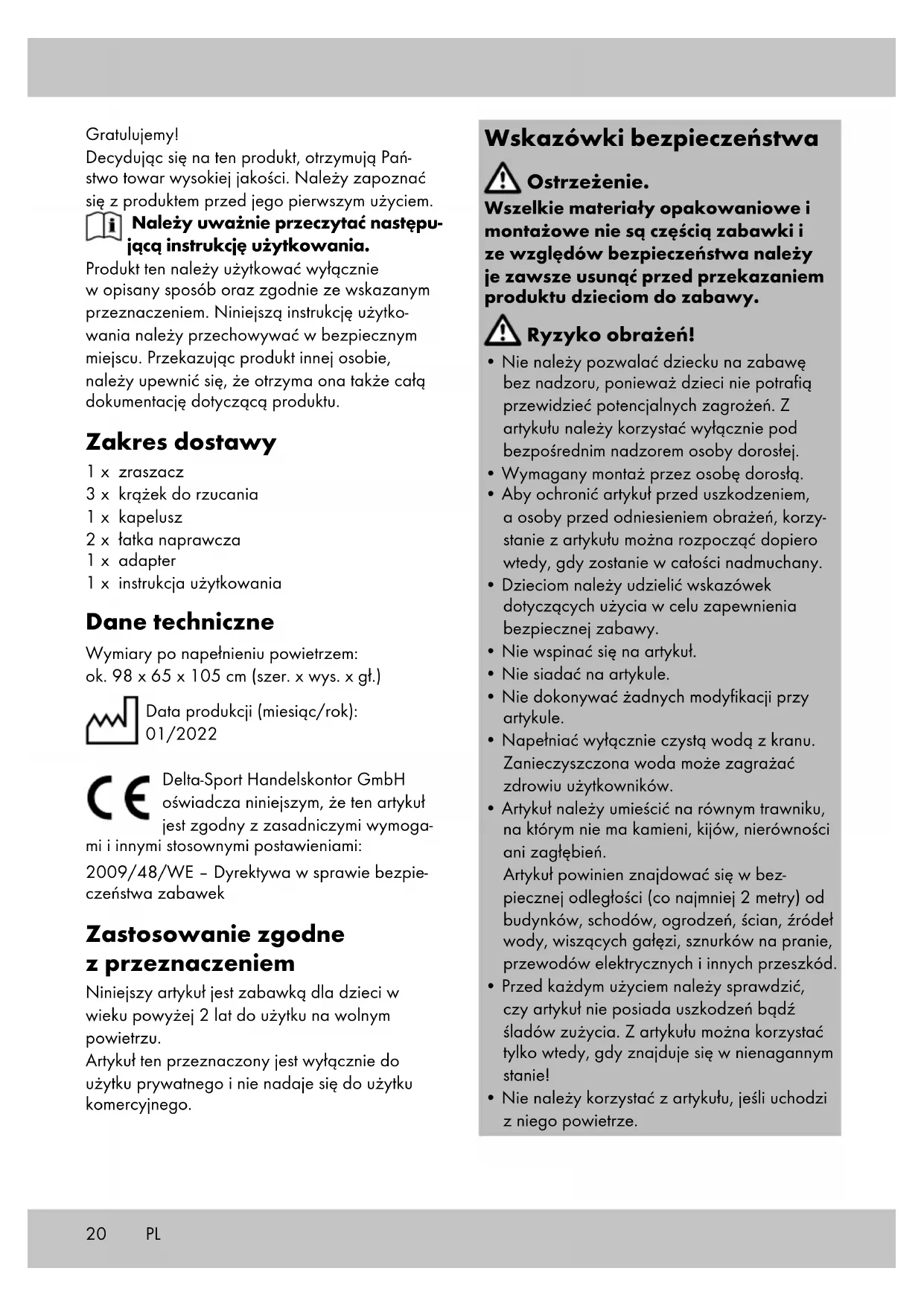 uszkodzone miejsce i mocno docisnąć. Przechowywanie, czyszczenie Podczas nieużywania należy zawsze przecho- wywać nienapompowany artykuł w suchym i czystym miejscu w temperaturze pokojowej. W trakcie przechowywania zawory muszą być przez cały czas zamknięte. Artykuł czyścić tylko wodą lub wodą z mydłem, nigdy przy użyciu ostrych środków czyszczących. Podczas przechowywania przez zimę nie umieszczać na artykule żadnych ostrych przedmiotów i nie posypywać talkiem. Uwagi odnośnie recyklingu Artykuł oraz materiały opakowaniowe nale- ży usunąć zgodnie z aktualnymi przepisami obowiązującymi w danym miejscu. Materiały opakowaniowe, jak np. worki foliowe nie powinny znaleźć się w rękach dzieci. Materiał opakowaniowy należy przechowywać w miej- scu niedostępnym dla dzieci. Zutylizować produkt i opakowanie w sposób przyjazny dla środowiska. Kod materiału do recyklingu służy do oznaczenia różnych materiałów przeznaczonych do zwrotu do przetwór- stwa wtórnego (recyklingu). Kod składa się z symbolu, który powinien odzwierciedlać cykl odzysku, oraz numeru oznaczającego materiał. Wskazówki dotyczące gwa- rancji i obsługi serwisowej Artykuł został wyprodukowany z najwyższą starannością i pod stałą kontrolą. DELTA-SPORT HANDELSKONTOR GmbH przyznaje klien- towi końcowemu na niniejszy artykuł trzy lata gwarancji od daty zakupu (okres gwarancyjny) z zastrzeżeniem poniższych postanowień. PL23 Gwarancja dotyczy wyłącznie wad mate- riałowych i wad wykonania. Gwarancja nie obejmuje części, które podlegają normalnemu zużyciu i z tego względu należy je traktować jako części zużywalne (np. baterie) i nie obejmuje części kruchych, np. przełączników, akumulatorów ani części wykonanych ze szkła. Wyklucza się roszczenia z tytułu niniejszej gwa- rancji w przypadku użycia artykułu w sposób niewłaściwy lub sprzeczny z jego przeznacze- niem lub w sposób wykraczający poza przewi- dziane przeznaczenie lub poza przewidziany zakres użytkowania lub jeśli wytyczne zawarte w instrukcji obsługi nie były przestrzegane, chyba że klient końcowy udowodni istnienie wady materiałowej lub wady wykonania, która nie wynika z podanych wyżej przyczyn. Roszczenia z tytułu gwarancji można zgłaszać wyłącznie w okresie gwarancyjnym za okaza- niem oryginalnego dowodu zakupu. Prosimy zatem zachować oryginalny dowód zakupu! W przypadku jakichkolwiek reklamacji prosimy skontaktować się z nami najpierw za pośred- nictwem podanej poniżej infolinii serwisowej lub drogą e-mailową. W przypadku objętym gwarancją artykuł zostanie – według naszego uznania – bezpłatnie naprawiony, wymieniony lub nastąpi zwrot ceny zakupu. Z gwarancji nie wynikają żadne inne prawa. Niniejsza gwarancja nie ogranicza Państwa ustawowych praw, w szczególności roszczeń gwarancyjnych wobec danego sprzedawcy. W przypadku wymiany części lub całego arty- kułu okres gwarancji przedłuża się o trzy lata zgodnie z art. 581 § 1 kodeksu cywilnego. Po upłynięciu czasu gwarancji powstałe naprawy są płatne. IAN: 398788_2107 Serwis Polska Tel.: 22 397 4996 E-Mail: deltasport@lidl.pl PL24 CZ Srdečně blahopřejeme! Svým nákupem jste se rozhodli pro kvalitní výro- bek. Před prvním použitím se prosím seznamte s tímto výrobkem. Pozorně si přečtete následující návod k použití. Používejte tento výrobek pouze tak, jak je popsáno, a pro uvedené účely. Uschovejte si tento návod k použití pro budoucí použití. Pokud výrobek předáte třetí osobě, předejte jí i veške- rou dokumentaci. Rozsah dodávky 1 x vodní postřikovač 3 x házecí kroužek 1 x klobouček 2 x záplata na opravu 1 x adaptér 1 x návod k použití Technická data Rozměry (nafouknuto): cca 98 x 65 x 105 cm (š x v x hl.) Datum výroby (měsíc/rok): 01/2022 Delta-Sport Handelskontor GmbH tímto prohlašuje, že tento výrobek je ve shodě s následujícími základními požadavky a ostatními příslušnými ustanoveními: 2009/48/EU – směrnice o hračkách Použití ke stanovenému účelu Tento výrobek je hračka pro děti od 2 let pro venkovní použití. Výrobek je určen pouze pro privátní potřebu a nikoli pro podnikatelské použití. Bezpečnostní pokyny Upozornění. Všechny obalové a upevňovací materi- ály nejsou součástí hračky a musí být z bezpečnostních důvodů vždy odstra- něny před tím, než výrobek předáte dětem na hraní. Nebezpečí úrazu!
