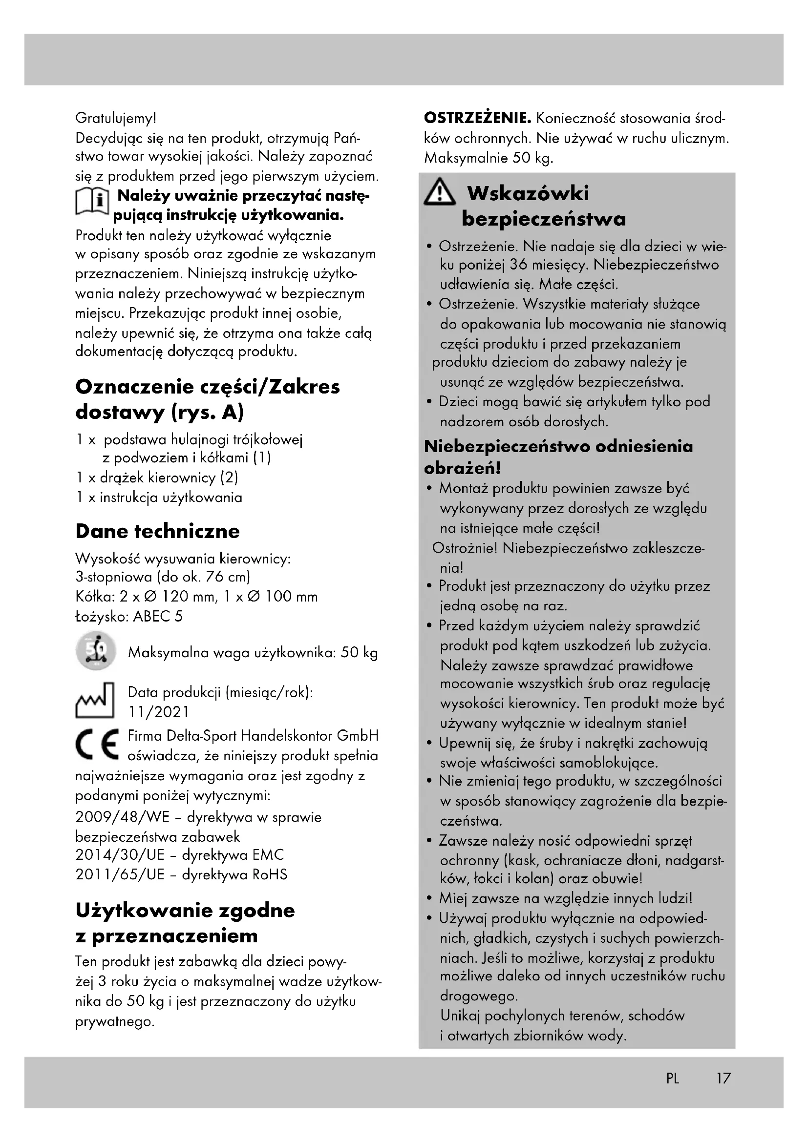 ton/80 - 98: composietmaterialen. Het artikel en de verpakkingsmaterialen zijn recyclebaar; voer ze gescheiden af voor een be- tere afvalbehandeling. Het Triman-logo is alleen van toepassing voor Frankrijk. Informatie over de mogelijkheden om het afgedankte artikel af te voeren, wordt verstrekt door de gemeentelijke overheid. Opmerkingen over garantie en serviceafhandeling Het artikel werd met de grootste zorgvuldigheid en onder permanent toezicht geproduceerd. De firma DELTA-SPORT HANDELSKONTOR GmbH verleent particuliere eindklanten op dit artikel drie jaar garantie, te rekenen vanaf de datum van aankoop (garantietermijn) en dit op grond van de volgende bepalingen. De garantie geldt alleen voor materiaal- en verwerkingsfouten. De garantie is niet van toepassing op onderde- len die aan een normale slijtage onderhevig zijn en daarom als niet-slijtvaste onderdelen te beschouwen zijn (bv. batterijen) en evenmin op breekbare onderdelen, bv. schakelaars, accu’s of onderdelen die van glas gemaakt zijn. NL/BE17 Gratulujemy! Decydując się na ten produkt, otrzymują Pań- stwo towar wysokiej jakości. Należy zapoznać się z produktem przed jego pierwszym użyciem. Należy uważnie przeczytać nastę- pującą instrukcję użytkowania. Produkt ten należy użytkować wyłącznie w opisany sposób oraz zgodnie ze wskazanym przeznaczeniem. Niniejszą instrukcję użytko- wania należy przechowywać w bezpiecznym miejscu. Przekazując produkt innej osobie, należy upewnić się, że otrzyma ona także całą dokumentację dotyczącą produktu. Oznaczenie części/Zakres dostawy (rys. A) 1 x podstawa hulajnogi trójkołowej z podwoziem i kółkami (1) 1 x drążek kierownicy (2) 1 x instrukcja użytkowania Dane techniczne Wysokość wysuwania kierownicy: 3-stopniowa (do ok. 76 cm) Kółka: 2 x Ø 120 mm, 1 x Ø 100 mm Łożysko: ABEC 5 Maksymalna waga użytkownika: 50 kg Data produkcji (miesiąc/rok): 11/2021 Firma Delta-Sport Handelskontor GmbH oświadcza, że niniejszy produkt spełnia najważniejsze wymagania oraz jest zgodny z podanymi poniżej wytycznymi: 2009/48/WE – dyrektywa w sprawie bezpieczeństwa zabawek 2014/30/UE – dyrektywa EMC 2011/65/UE – dyrektywa RoHS Użytkowanie zgodne z przeznaczeniem Ten produkt jest zabawką dla dzieci powy- żej 3 roku życia o maksymalnej wadze użytkow- nika do 50 kg i jest przeznaczony do użytku prywatnego. OSTRZEŻENIE. Konieczność stosowania środ- ków ochronnych. Nie używać w ruchu ulicznym. Maksymalnie 50 kg. Wskazówki bezpieczeństwa