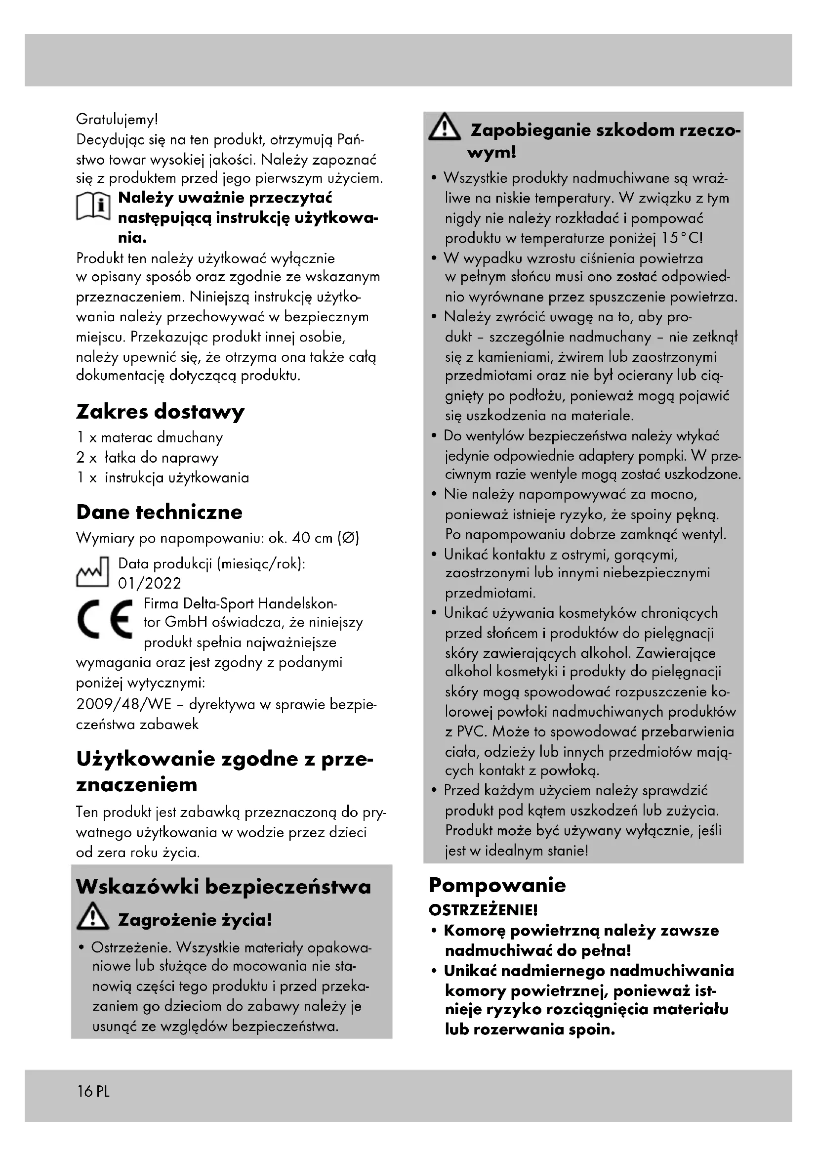 - Usunąć łatkę z papieru, umieścić ją na uszko- dzonym miejscu i mocno docisnąć. Przechowywanie, czyszcze- nie Podczas nieużywania należy zawsze przecho- wywać produkt z wypuszczonym powietrzem w suchym i czystym miejscu, w temperaturze pokojowej. Podczas przechowywania zawór powinien być zawsze zamknięty. Nie kłaść ostrych przedmio- tów na produkcie podczas jego przechowy- wania w okresie zimowym i nie posypywać go talkiem. Czyścić wyłącznie przy użyciu wilgotnej ście- reczki, następnie wytrzeć do sucha. WAŻNE! Nie czyścić przy użyciu ostrych środ- ków czyszczących. Uwagi odnośnie recyklingu Artykuł oraz materiały opakowaniowe nale- ży usunąć zgodnie z aktualnymi przepisami obowiązującymi w danym miejscu. Materiały opakowaniowe, jak np. worki foliowe nie powinny znaleźć się w rękach dzieci. Materiał opakowaniowy należy przechowywać w miej- scu niedostępnym dla dzieci. Zutylizować produkt i opakowanie w sposób przyjazny dla środowiska. Kod materiału do recyklingu służy do oznaczenia różnych materiałów przeznaczonych do zwrotu do przetwór- stwa wtórnego (recyklingu). Kod składa się z symbolu, który powinien odzwierciedlać cykl odzysku, oraz numeru oznaczającego materiał. Wskazówki dotyczące gwa- rancji i obsługi serwisowej Artykuł został wyprodukowany z najwyższą starannością i pod stałą kontrolą. DELTA-SPORT HANDELSKONTOR GmbH przyznaje klien- towi końcowemu na niniejszy artykuł trzy lata gwarancji od daty zakupu (okres gwarancyjny) z zastrzeżeniem poniższych postanowień. Gwa- rancja dotyczy wyłącznie wad materiałowych i wad wykonania. PL18 PL Gwarancja nie obejmuje części, które podlega- ją normalnemu zużyciu i z tego względu należy je traktować jako części zużywalne (np. baterie) i nie obejmuje części kruchych, np. przełączni- ków, akumulatorów ani części wykonanych ze szkła. Wyklucza się roszczenia z tytułu niniejszej gwa- rancji w przypadku użycia artykułu w sposób niewłaściwy lub sprzeczny z jego przeznacze- niem lub w sposób wykraczający poza przewi- dziane przeznaczenie lub poza przewidziany zakres użytkowania lub jeśli wytyczne zawarte w instrukcji obsługi nie były przestrzegane, chyba że klient końcowy udowodni istnienie wady materiałowej lub wady wykonania, która nie wynika z podanych wyżej przyczyn. Roszczenia z tytułu gwarancji można zgłaszać wyłącznie w okresie gwarancyjnym za okaza- niem oryginalnego dowodu zakupu. Prosimy zatem zachować oryginalny dowód zakupu! W przypadku jakichkolwiek reklamacji prosimy skontaktować się z nami najpierw za pośred- nictwem podanej poniżej infolinii serwisowej lub drogą e-mailową. W przypadku objętym gwarancją artykuł zostanie – według naszego uznania – bezpłatnie naprawiony, wymieniony lub nastąpi zwrot ceny zakupu. Z gwarancji nie wynikają żadne inne prawa. Niniejsza gwarancja nie ogranicza Państwa ustawowych praw, w szczególności roszczeń gwarancyjnych wobec danego sprzedawcy. W przypadku wymiany części lub całego arty- kułu okres gwarancji przedłuża się o trzy lata zgodnie z art. 581 § 1 kodeksu cywilnego. Po upłynięciu czasu gwarancji powstałe naprawy są płatne. IAN: 399689_2107 Serwis Polska Tel.: 22 397 4996 E-Mail: deltasport@lidl.pl19CZ Srdečně blahopřejeme! Svým nákupem jste se rozhodli pro kvalitní výrobek. Před prvním použi- tím se prosím seznamte s tímto výrobkem. Pozorně si přečtete následující návod k použití. Používejte tento výrobek pouze tak, jak je popsáno, a pro uvedené účely. Uschovejte si tento návod k použití pro budoucí použití. Pokud výrobek předáte třetí osobě, předejte jí i veške- rou dokumentaci. Obsah balení 1 x nafukovací míč 2 x záplaty k opravě 1 x návod k použití Technické údaje Rozměry v nafouknutém stavu: cca 40 cm (Ø) Datum výroby (měsíc/rok): 01/2022 Společnost Delta-Sport Handelskon- tor GmbH tímto prohlašuje, že tento výrobek je v souladu s následujícími základními požadavky a ostatními příslušnými ustanoveními: 2009/48/ES – Směrnice o bezpečnosti hraček Použití dle určení Tento výrobek je koncipován jako hračka k po- užití na vodě pro děti od nula let a je určen pro soukromé použití. Bezpečnostní pokyny Nebezpečí ohrožení života!