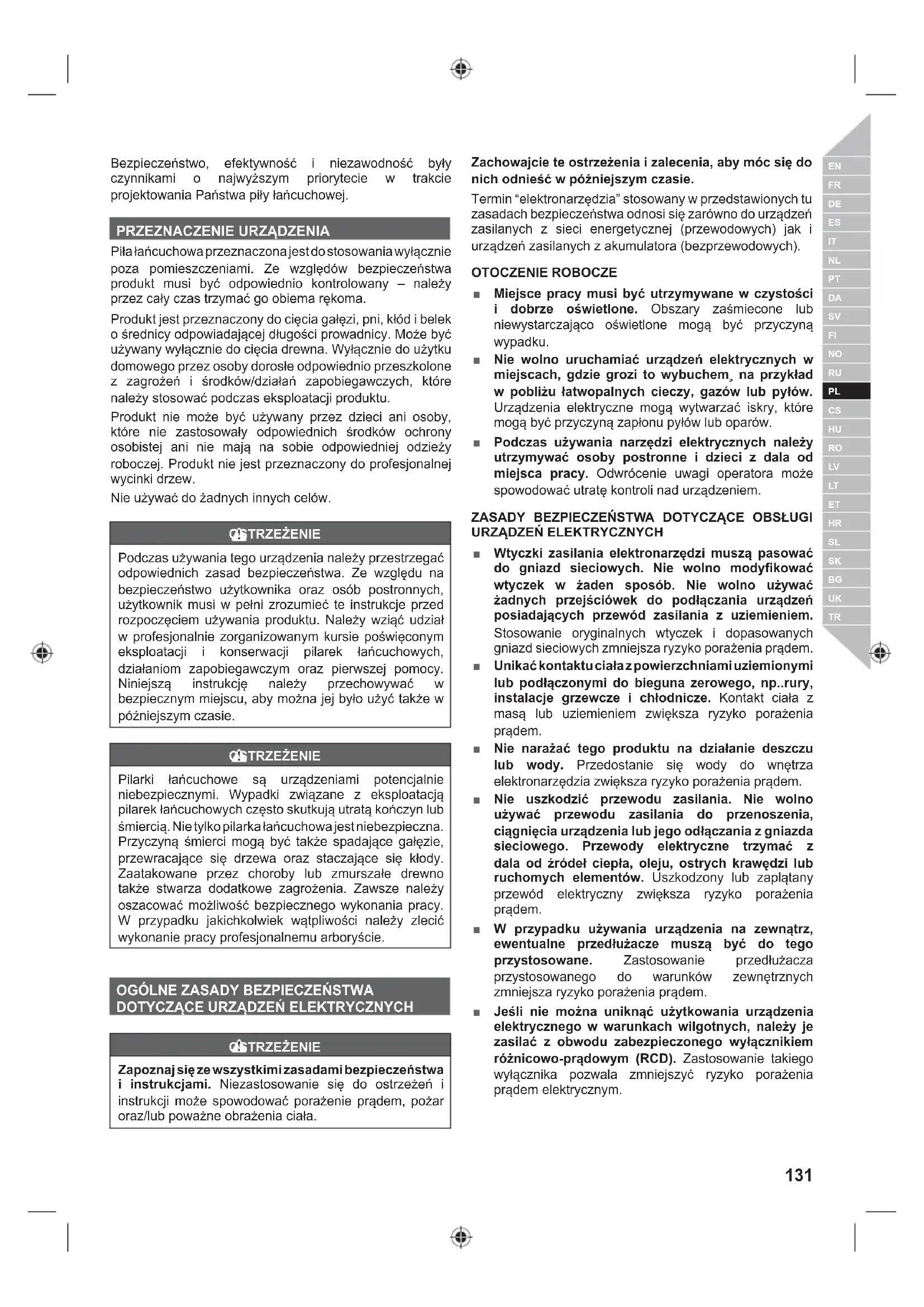 ■ Należy zwrócić uwagę na odrzucane, latające lub spadające obiekty. Wszystkie osoby postronne, dzieci oraz zwierzęta powinny znajdować się w odległości co najmniej 15 m od miejsca pracy. ■ Nie wolno pracować przy niedostatecznym oświetleniu. Operator musi dobrze widzieć miejsce pracy, aby móc zidentyfikować potencjalne zagrożenia. ■ Stosowanie środków ochrony słuchu zmniejsza słyszalność ostrzeżeń (alarmów, okrzyków). Należy zwracać większą uwagę na to, co dzieje się w miejscu pracy. ■ Praca podobnych narzędzi w pobliżu zwiększa ryzyko urazu słuchu oraz wtargnięcia innej osoby na miejsce pracy. ■ Stać stabilnie, zachowując równowagę. Nie sięgać zbyt daleko. Nadmierne wychylanie się może spowodować utratę równowagi i zwiększa ryzyko odskoku. ■ Należy starać się trzymać wszystkie części ciała z dala od ruchomych elementów urządzenia. ■ Części te mocno nagrzewają się w czasie eksploatacji. Należy sprawdzić, czy wszystkie przyrządy urządzenia, w tym hamulec łańcucha, działają prawidłowo. Należy sprawdzić, czy mocowania nie są poluzowane, upewnić się, czy wszystkie osłony oraz uchwyty są prawidłowo i solidnie zamocowane. Przed przystąpieniem do pracy należy wymienić wszystkie uszkodzone części. ■ Nie wolno w żaden sposób modyfikować produktu ani stosować w nim części oraz akcesoriów, które nie są zalecane przez producenta. ■ Skok mocy powoduje wahania napięcia, które mogą oddziaływać na pracę innych urządzeń elektrycznych podłączonych do tego samego obwodu elektrycznego. Podłączyć produkt do źródła zasilania o impedancji wynoszącej maks. 0.33 Ω, aby ograniczyć wahania napięcia. Dodatkowe informacje można uzyskać u dostawcy energii elektrycznej. OSTRZEŻENIE W przypadku upuszczenia produktu, narażenia go na silne uderzenie lub w przypadku zaobserwowania nadmiernych drgań, należy natychmiast wyłączyć urządzenie i sprawdzić, czy nie wykazuje ono uszkodzeń oraz ustalić przyczynę drgań. Wszelkie uszkodzone części muszą być odpowiednio naprawione lub wymienione w autoryzowanym punkcie serwisowym. ■ Urządzenie powinno być zasilane przez wyłącznik różnicowo-prądowy (RCD), o prądzie zadziałania nie większym niż 30 mA. ■ Jeśli konieczne jest użycie przedłużacza, należy upewnić się, że nadaje się on do stosowania na zewnątrz pomieszczeń oraz że ma parametry (moc podłączonych urządzeń) umożliwiające podłączenie danego produktu. Sprawdzić przed każdym użyciem, czy nie ma uszkodzeń. Zawsze należy rozwijać go podczas użytkowania, ponieważ zwinięte kable mogą ulec przegrzaniu. Nie wolno naprawiać uszkodzonych przedłużaczy. Należy wymienić je na produkt o takich samych parametrach. ■ Jeżeli kabel zasilający ulegnie uszkodzeniu, musi zostać wymieniony przed rozpoczęciem użytkowania. ■ Należy upewnić się, że przewód zasilający jest umieszczony w taki sposób, że nie można go uszkodzić poprzez przecięcie, nie zostanie nadepnięty, zaczepiony lub uszkodzony lub narażony w inny sposób. ■ Nie podnosić ani nie przenosić produktu za przewód elektryczny. ■ Nie ciągnąć za przewód zasilania w celu wyjęcia wtyczki z gniazda. ■ Przewód zasilania trzymać z dala od źródeł ciepła, oleju i ostrych krawędzi. ■ Przed każdym użyciem należy sprawdzić, czy przewód zasilający nie jest uszkodzony. W przypadku stwierdzenia oznak uszkodzenia należy oddać urządzenie do naprawy wykwalifikowanemu specjaliście do autoryzowanego punktu serwisowego, aby uniknąć zagrożenia.