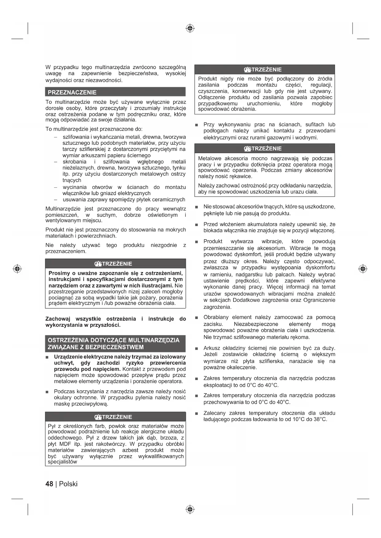 ELW przypadku tego multinarzędzia zwrócono szczególną uwagę na zapewnienie bezpieczeństwa, wysokiej wydajności oraz niezawodności. PRZEZNACZENIE To multinarzędzie może być używane wyłącznie przez dorosłe osoby, które przeczytały i zrozumiały instrukcje oraz ostrzeżenia podane w tym podręczniku oraz, które mogą odpowiadać za swoje działania. To multinarzędzie jest przeznaczone do: – szlifowania i wykańczania metali, drewna, tworzywa sztucznego lub podobnych materiałów, przy użyciu tarczy szlifierskiej z dostarczonymi przyciętymi na wymiar arkuszami papieru ściernego – skrobania i szlifowania wgłębnego metali nieżelaznych, drewna, tworzywa sztucznego, tynku itp. przy użyciu dostarczonych metalowych ostrzy tnących – wycinania otworów w ścianach do montażu włączników lub gniazd elektrycznych – usuwania zaprawy spomiędzy płytek ceramicznych Multinarzędzie jest przeznaczone do pracy wewnątrz pomieszczeń, w suchym, dobrze oświetlonym i wentylowanym miejscu. Produkt nie jest przeznaczony do stosowania na mokrych materiałach i powierzchniach. Nie należy używać tego produktu niezgodnie z przeznaczeniem. OSTRZEŻENIE Prosimy o uważne zapoznanie się z ostrzeżeniami, instrukcjami i specyfikacjami dostarczonymi z tym narzędziem oraz z zawartymi w nich ilustracjami. Nie przestrzeganie przedstawionych nizej zaleceń mogłoby pociagnąć za sobą wypadki takie jak pożary, porażenia prądem elektrycznym i /lub poważne obrażenia ciała. Zachowaj wszystkie ostrzeżenia i instrukcje do wykorzystania w przyszłości.