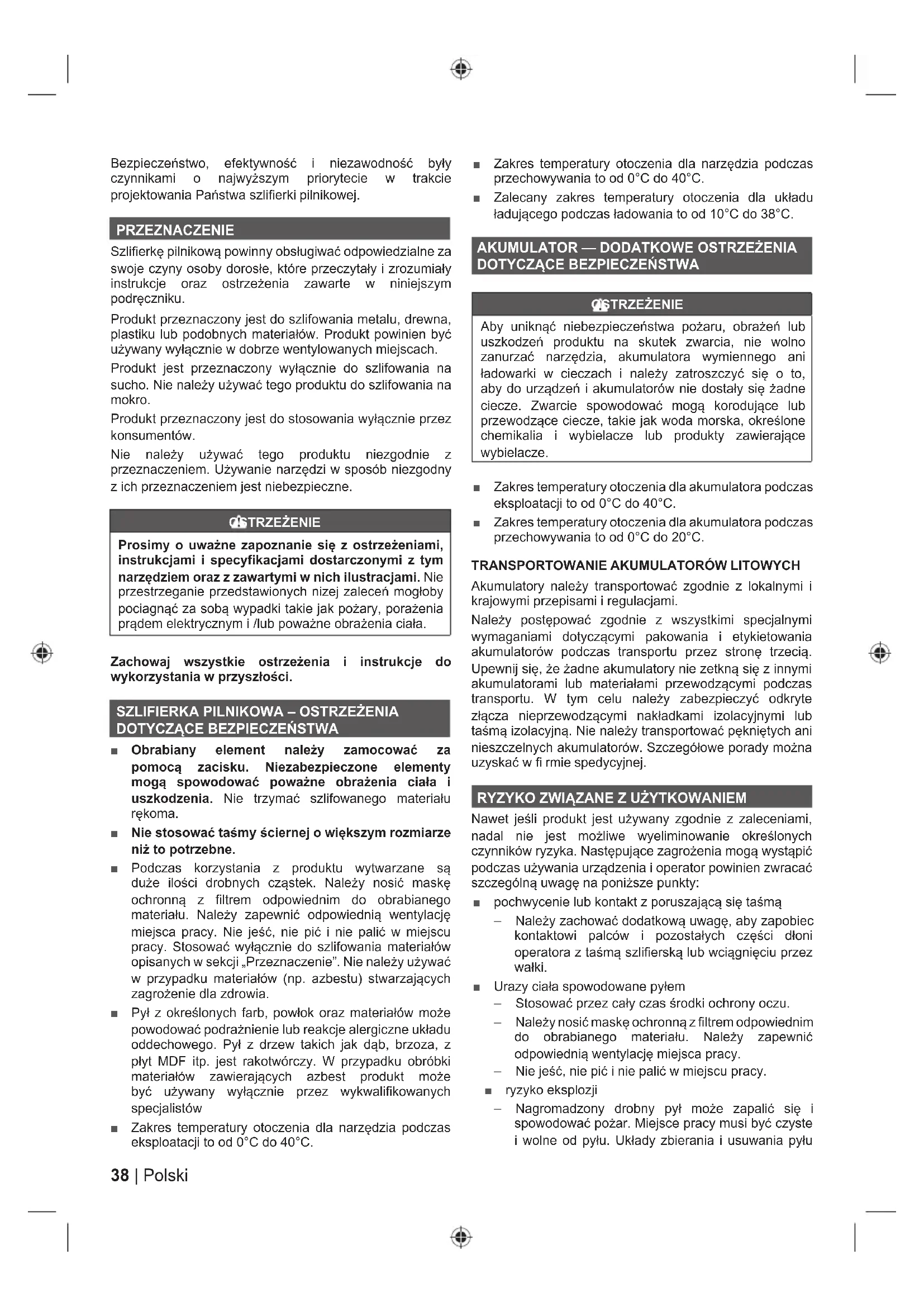 ■ Obrabiany element należy zamocować za pomocą zacisku. Niezabezpieczone elementy mogą spowodować poważne obrażenia ciała i uszkodzenia. Nie trzymać szlifowanego materiału rękoma. ■ Nie stosować taśmy ściernej o większym rozmiarze niż to potrzebne. ■ Podczas korzystania z produktu wytwarzane są duże ilości drobnych cząstek. Należy nosić maskę ochronną z filtrem odpowiednim do obrabianego materiału. Należy zapewnić odpowiednią wentylację miejsca pracy. Nie jeść, nie pić i nie palić w miejscu pracy. Stosować wyłącznie do szlifowania materiałów opisanych w sekcji „Przeznaczenie”. Nie należy używać w przypadku materiałów (np. azbestu) stwarzających zagrożenie dla zdrowia. ■ Pył z określonych farb, powłok oraz materiałów może powodować podrażnienie lub reakcje alergiczne układu oddechowego. Pył z drzew takich jak dąb, brzoza, z płyt MDF itp. jest rakotwórczy. W przypadku obróbki materiałów zawierających azbest produkt może być używany wyłącznie przez wykwalifikowanych specjalistów ■ Zakres temperatury otoczenia dla narzędzia podczas eksploatacji to od 0°C do 40°C. ■ Zakres temperatury otoczenia dla narzędzia podczas przechowywania to od 0°C do 40°C. ■ Zalecany zakres temperatury otoczenia dla układu ładującego podczas ładowania to od 10°C do 38°C.