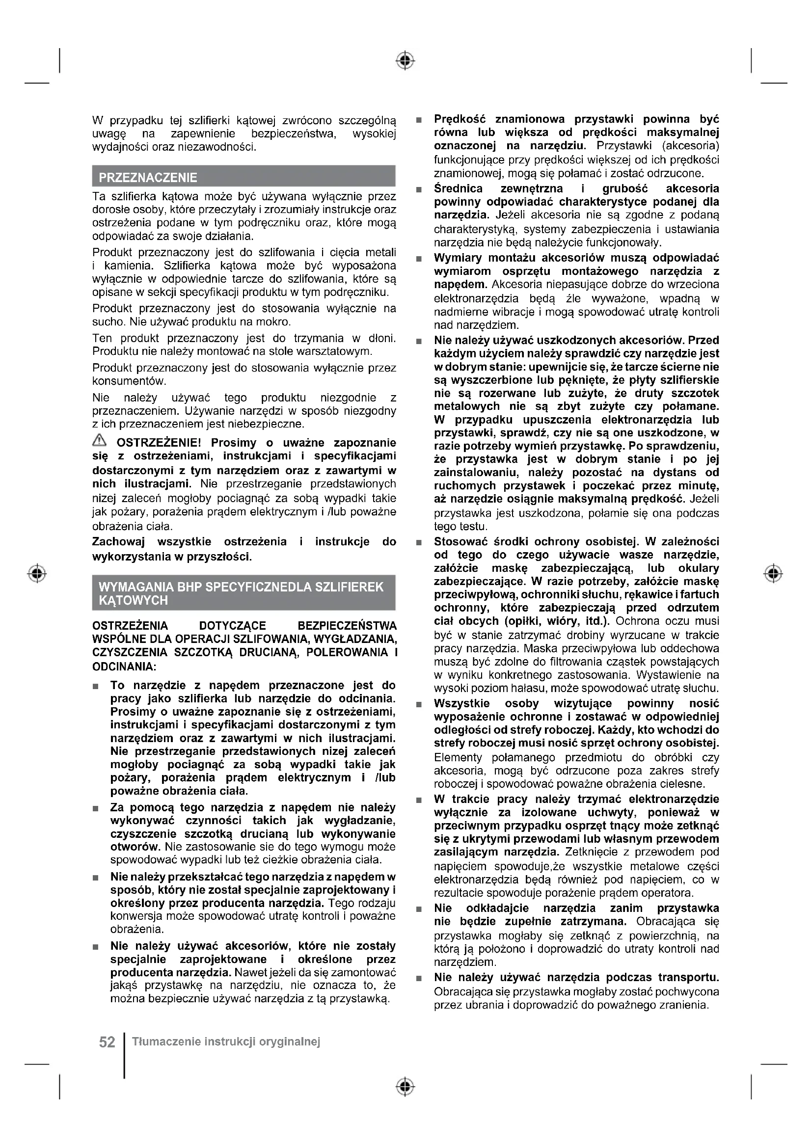 Tłumaczenie instrukcji oryginalnej W przypadku tej szlifi erki kątowej zwrócono szczególną uwagę na zapewnienie bezpieczeństwa, wysokiej wydajności oraz niezawodności. PRZEZNACZENIE Ta szlifi erka kątowa może być używana wyłącznie przez dorosłe osoby, które przeczytały i zrozumiały instrukcje oraz ostrzeżenia podane w tym podręczniku oraz, które mogą odpowiadać za swoje działania. Produkt przeznaczony jest do szlifowania i cięcia metali i kamienia. Szlifi erka kątowa może być wyposażona wyłącznie w odpowiednie tarcze do szlifowania, które są opisane w sekcji specyfi kacji produktu w tym podręczniku. Produkt przeznaczony jest do stosowania wyłącznie na sucho. Nie używać produktu na mokro. Ten produkt przeznaczony jest do trzymania w dłoni. Produktu nie należy montować na stole warsztatowym. Produkt przeznaczony jest do stosowania wyłącznie przez konsumentów. Nie należy używać tego produktu niezgodnie z przeznaczeniem. Używanie narzędzi w sposób niezgodny z ich przeznaczeniem jest niebezpieczne. OSTRZEŻENIE! Prosimy o uważne zapoznanie się z ostrzeżeniami, instrukcjami i specyfikacjami dostarczonymi z tym narzędziem oraz z zawartymi w nich ilustracjami. Nie przestrzeganie przedstawionych nizej zaleceń mogłoby pociagnąć za sobą wypadki takie jak pożary, porażenia prądem elektrycznym i /lub poważne obrażenia ciała. Zachowaj wszystkie ostrzeżenia i instrukcje do wykorzystania w przyszłości.